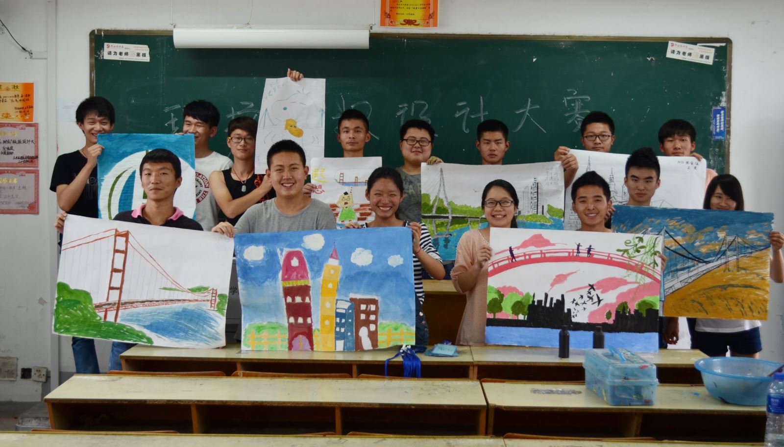 通過前期的宣傳工作,有三十余名海報設計愛好者報名參加了比賽,他們幾個人組成一隊進行比賽。有人負責畫畫,有人負責調配顏料,每個人都忙的不亦樂乎,活動現場異常火爆。他們統一在白色紙張或臨摹,或隨心所欲的繪畫出一幅幅極具個性的畫作。道路、橋梁、隧道、樓房這些跟土木學子今后的工作息息相關的場景一一出現在他們的作品當中,它們有的想法新穎,表現手法創新;有的色澤艷麗,視覺沖擊力強;還有的版面布局合理整潔;更有的主題鮮明,具有較強的感染力。表現出同學們豐富多彩的心靈世界以及對道路橋梁的認識。創意的碰撞,畫工的對決。創作過程中的歡樂笑語仿佛讓大家坐上時光機回到童年。