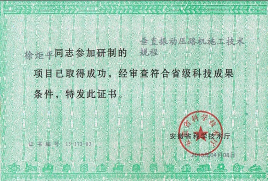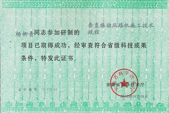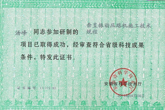 該項目于2011年8月正式立項,2014年8月正式完成,經(jīng)安徽省質(zhì)量技術(shù)監(jiān)督局批準(zhǔn)于2014年9月28日正式發(fā)布安徽省地方標(biāo)準(zhǔn)《垂直振動壓路機(jī)施工技術(shù)規(guī)程》(DB34/T 2152—2014),行業(yè)主管部門安徽省交通運(yùn)輸廳于2014年10月19日在合肥宣貫。