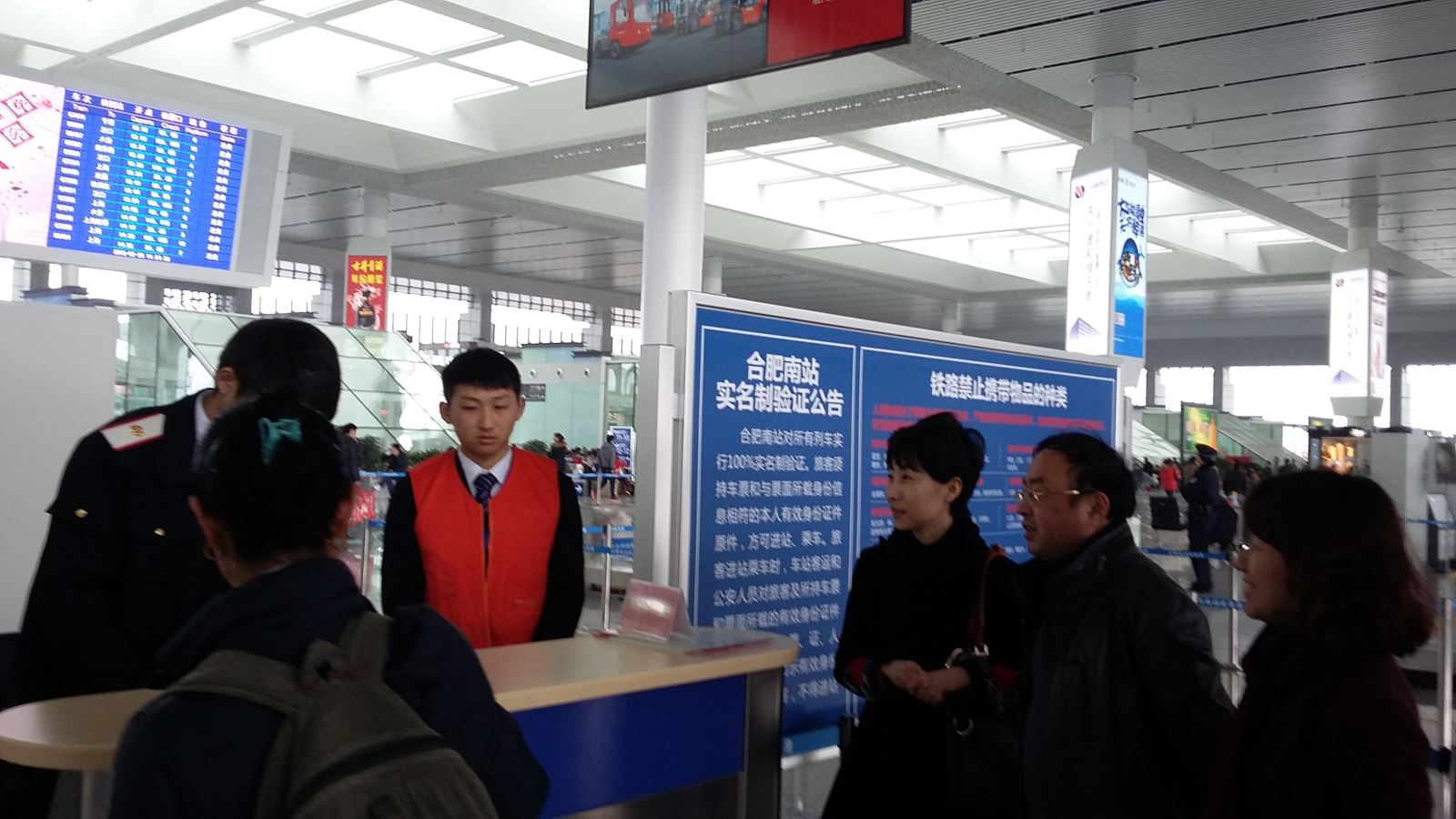 22日上午8點,被分成四組的志愿服務(wù)同學(xué),準(zhǔn)時出現(xiàn)在了合肥火車站、高鐵南站的候車大廳、售票廳、檢票口、特殊旅客服務(wù)臺等服務(wù)崗位。志愿者們頭戴小黃帽,身穿橙色馬甲,佩戴工作證件,快速地奔走在各個崗位上,被大家親切地稱為“小甜橙”,成為了火車站里一道靚麗的橙色風(fēng)景線。志愿者們在售票廳不厭其煩地協(xié)助乘客購票、取票、查詢、改簽;在入站口指示乘客進站;在候車大廳幫助乘客照看小孩、提行李、為乘客指路;遇到盲人等行動不便的乘客,同學(xué)們就幫助聯(lián)系車站工作人員為他們提供針對性服務(wù);看到乘客丟棄的垃圾就及時撿起來放入垃圾箱或者聯(lián)系車站清潔工清掃。他們的服務(wù)大大緩解了火車站工作人員的壓力,有效維護了春運乘車秩序。