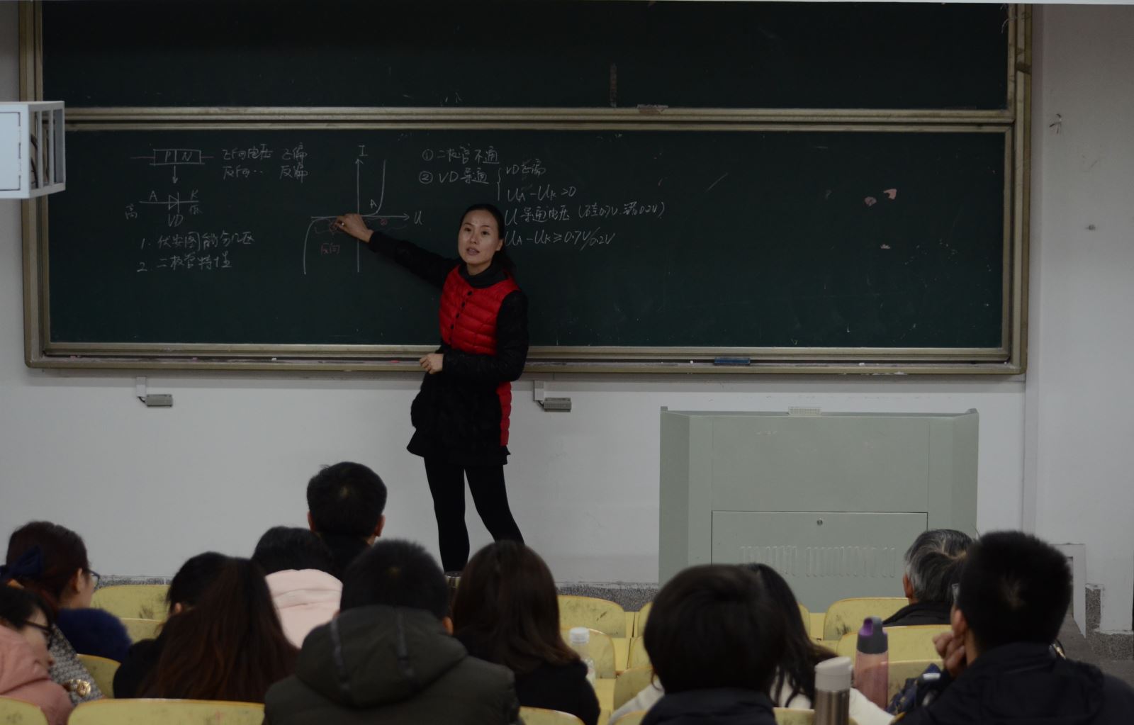 最后一位上臺展示的鐘曉旭老師采用了傳統的板書方式。她講課的內容為“二極管電路”。鐘老師由“PN結正偏,反偏現象”,入題,由此衍生二極管概念,再經由例題講解了二極管的特性以及在實際中的應用。三十分鐘的課程緊扣學生的實際學習狀況,鐘老師溫文爾雅的教態,循循善誘的講解拉近了枯燥的專業知識和學生之間的距離。