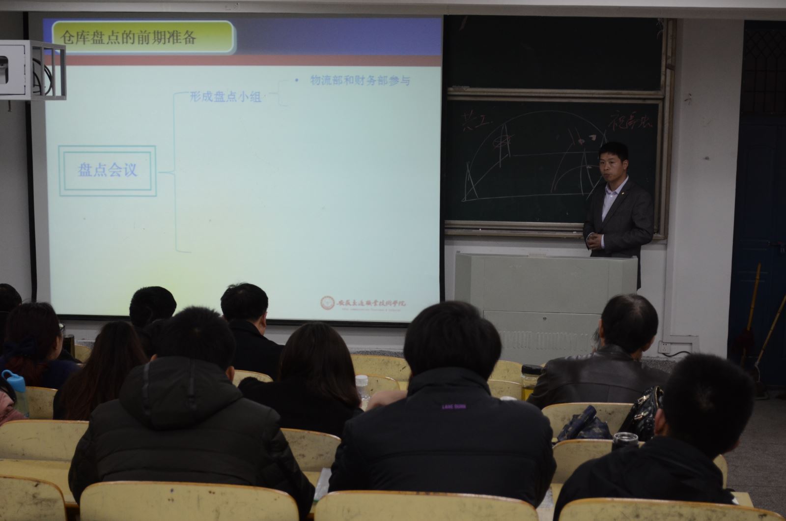 胡勇老師選擇講授《倉庫管理實務》課程中的“盤點”。“盤點目的,盤點方法,現場盤點,盤點結果”是胡老師此次講課的主要幾個方面。他的特點在于講課細致入微,將案例分析和理論講授緊密結合,環環相扣。“盤點表格制作,人員分工,正確處理異常情況”等主要知識點在他的講解下顯得淺顯易懂。
