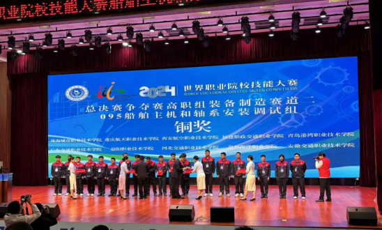10月28日至30日,2024年世界職業院校技能大賽總決賽爭奪賽高職組裝備制造賽道二船舶主機和軸系安裝調試組在天津海運職業學院舉行,來自全國21個省、自治區、直轄市高職院校的34支代表隊展開激烈角逐。由我院劉小四、何德榮兩位老師指導,輪機工程技術專業許宇樂、胡康紅、謝子攀、張樂盺四位同學組成的參賽團隊憑借扎實專業素養、團隊協作精神喜獲銅獎。