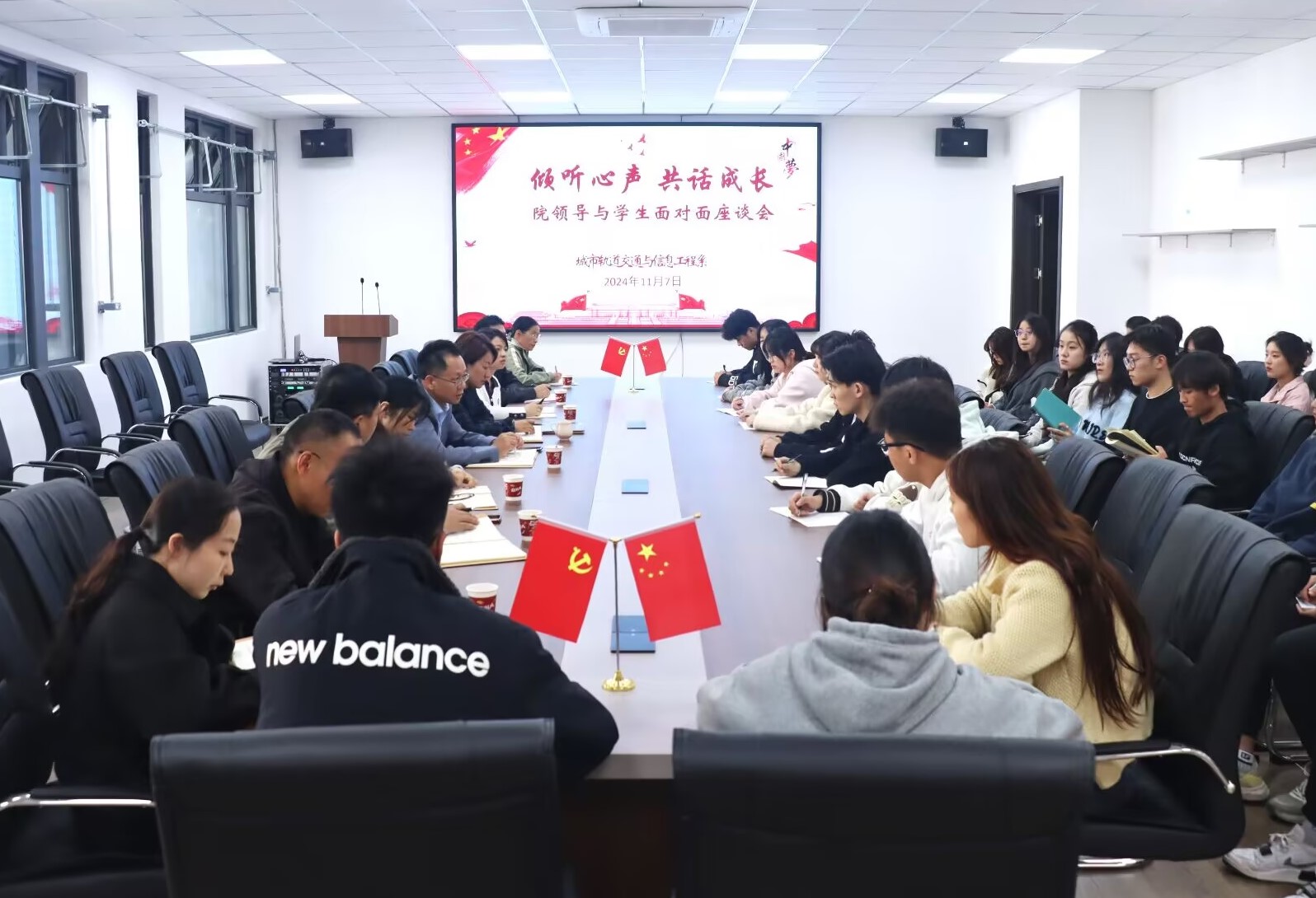 為深入學(xué)習(xí)貫徹習(xí)近平總書(shū)記考察安徽重要講話精神和黨的二十屆三中全會(huì)精神,全面落實(shí)立德樹(shù)人根本任務(wù),及時(shí)傾聽(tīng)、深入了解新橋校區(qū)廣大同學(xué)的學(xué)習(xí)生活狀況和意見(jiàn)訴求,11月7日下午,院黨委書(shū)記楊菲鈴赴城信系召開(kāi)“院領(lǐng)導(dǎo)與學(xué)生面對(duì)面”座談會(huì)。院學(xué)生處副處長(zhǎng)鄭顯鵬、總務(wù)處副處長(zhǎng)黃麗娟、城信系領(lǐng)導(dǎo)班子成員、部分學(xué)管老師以及來(lái)自全系2022級(jí)、2023級(jí)、2024級(jí)不同專業(yè)30名學(xué)生代表參加了座談會(huì)。