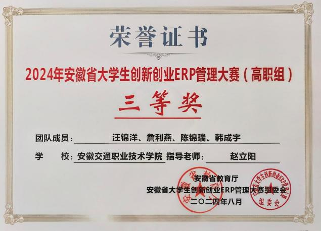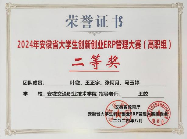 近日,由安徽省教育廳主辦的2024年安徽省大學生創新創業ERP管理大賽圓滿落下帷幕。經過激烈角逐,我院管理系王蛟、趙立陽老師指導的兩支參賽隊在高職組分別榮獲二等獎、三等獎。在比賽過程中,參賽團隊展現了出色的團隊協作能力和創新思維,成功應對了各項挑戰,最終取得了優異成績。