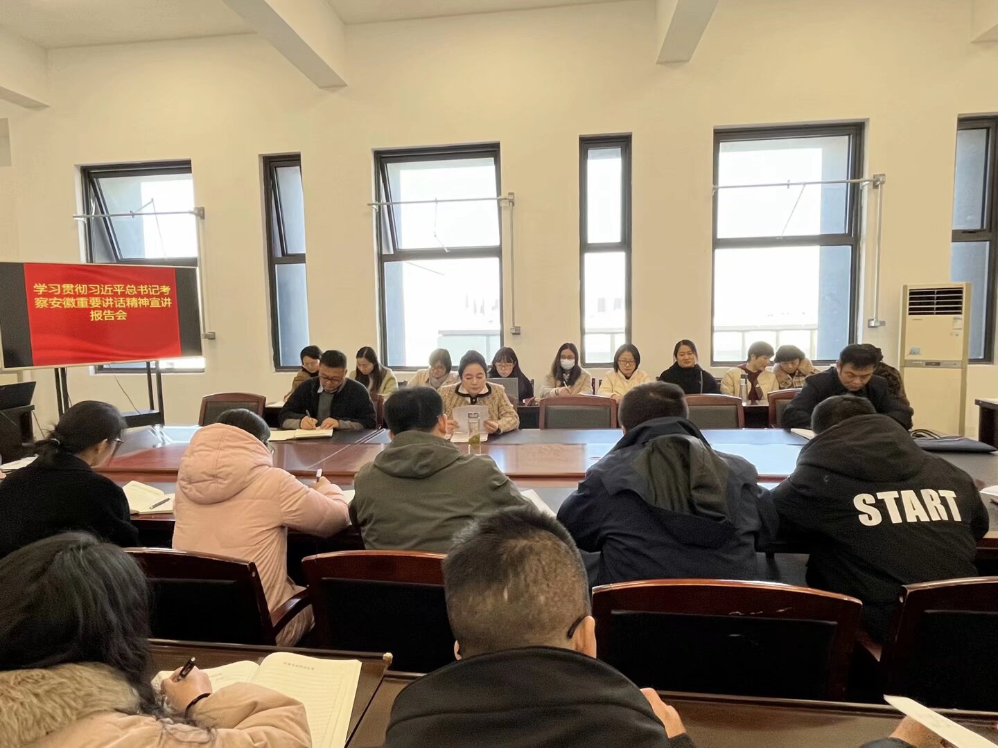 梁洪波以《從總書記“安徽行”中汲取奮斗力量,奮力譜寫安徽交院“兩高一本”新篇章》為題,圍繞充分認(rèn)識(shí)習(xí)近平總書記考察安徽重要講話的重大意義、深刻領(lǐng)會(huì)習(xí)近平總書記考察安徽重要講話精神的豐富內(nèi)涵、切實(shí)推動(dòng)習(xí)近平總書記考察安徽重要講話精神落地生根等方面,結(jié)合學(xué)院工作實(shí)際,進(jìn)行了系統(tǒng)闡述和深入解讀。