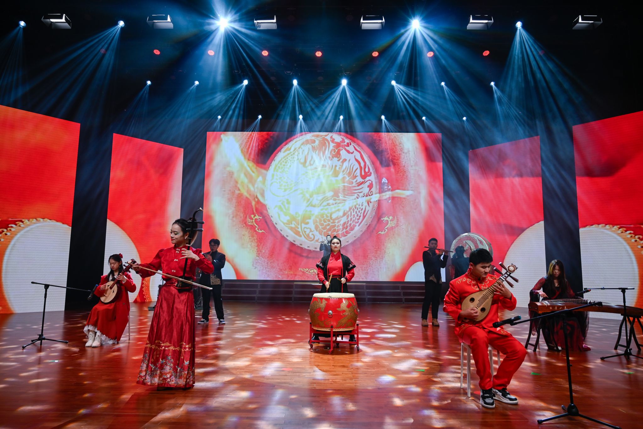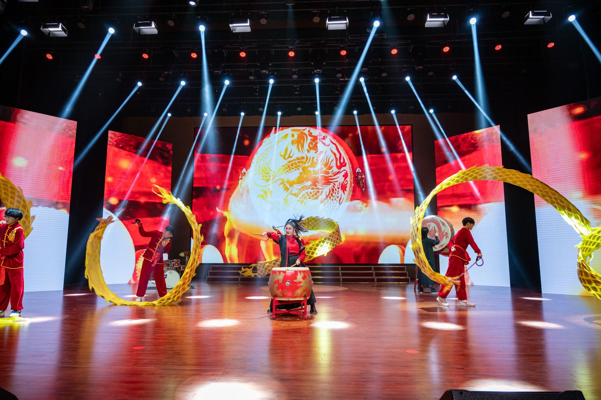 民族的就是世界的,民族樂器合奏奏響了對中華文明的深情詠嘆,更激蕩著新時(shí)代的活力與激情。大學(xué)生藝術(shù)團(tuán)與李思琪、吳嘉玥兩位老師聯(lián)袂奉獻(xiàn)了開場表演《鼓舞盛世 靈蛇報(bào)春》。