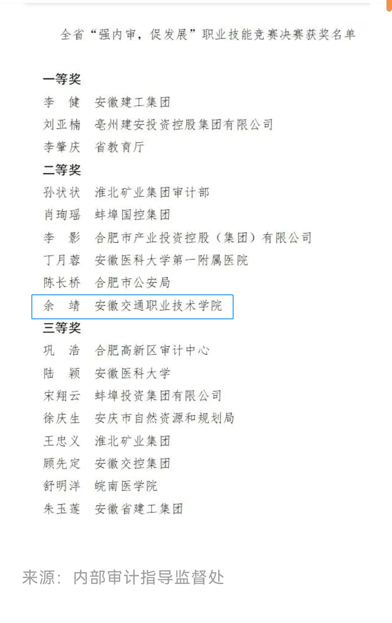 近日,由安徽省審計(jì)廳、安徽省總工會聯(lián)合舉辦的2024年全省“強(qiáng)內(nèi)審,促發(fā)展”職業(yè)技能競賽落下帷幕。我院教師余靖憑借扎實(shí)的專業(yè)知識和出色的業(yè)務(wù)能力,在眾多參賽選手中脫穎而出,榮獲二等獎。并被授予全省“優(yōu)秀內(nèi)部審計(jì)人員”榮譽(yù)稱號。