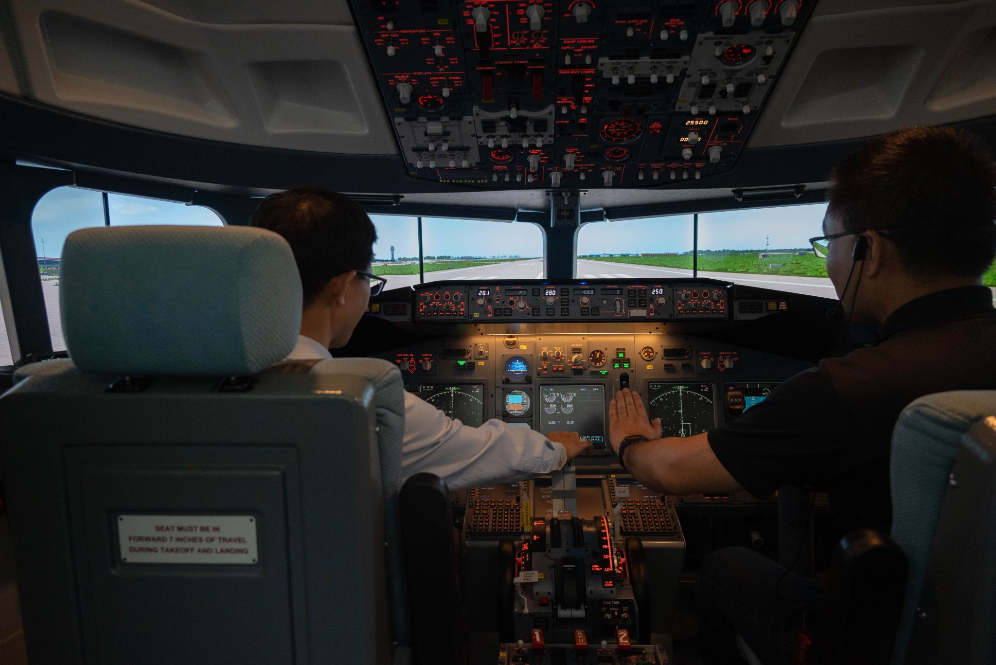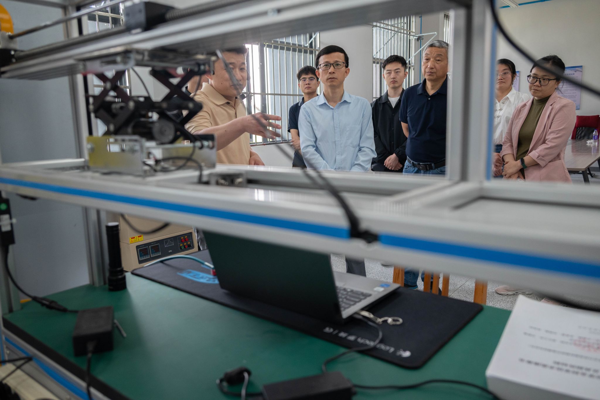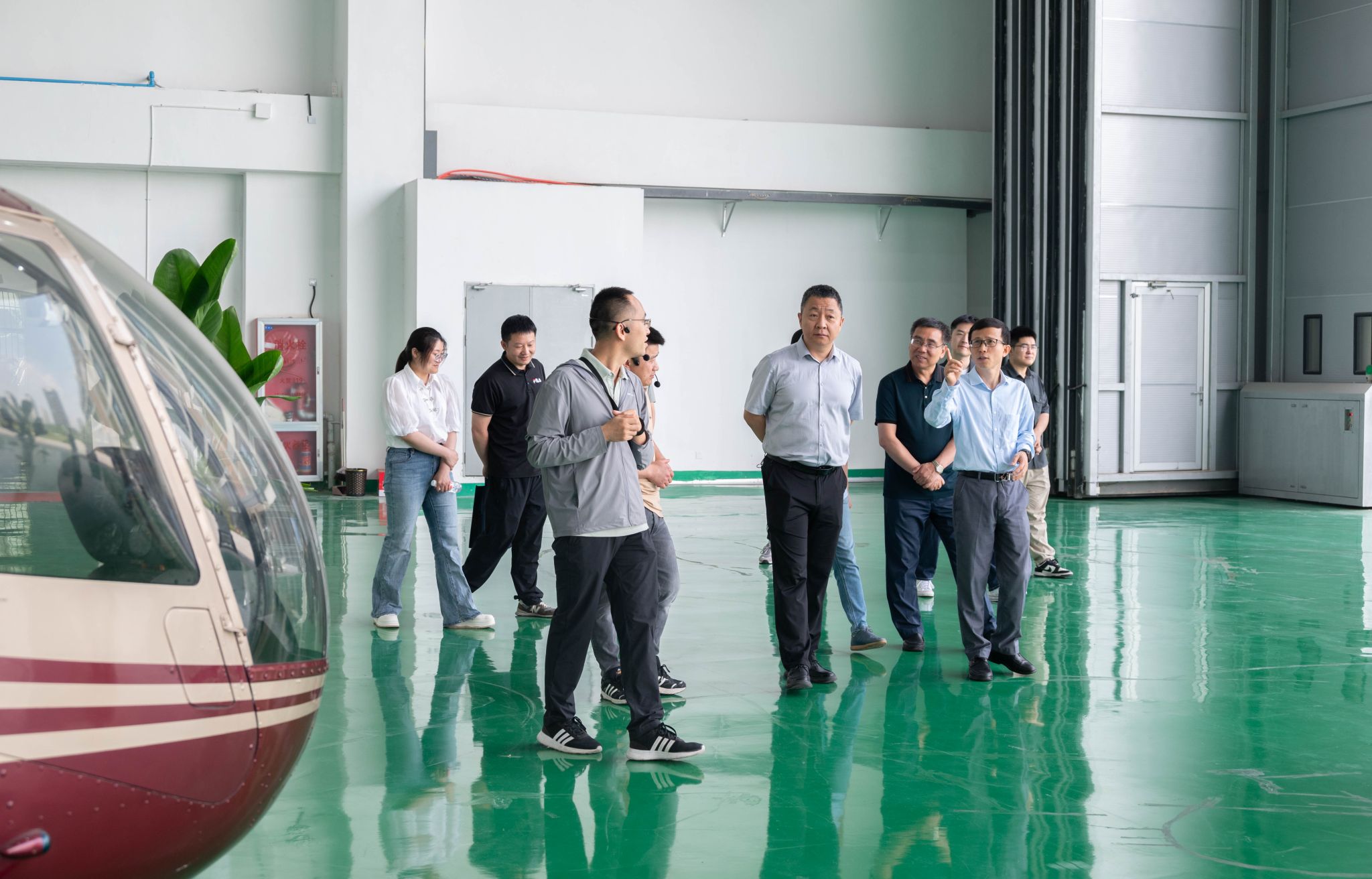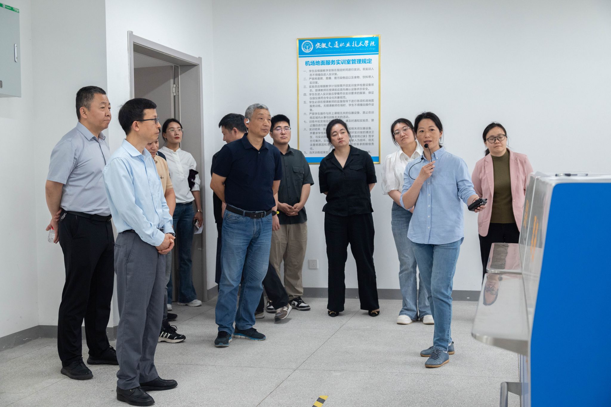 在航空系,大家分別參觀了航空器燃料重點實驗室、民航運輸地面服務實訓室、無人機實訓室、飛行模擬器實訓室、飛機機庫五大實訓場景。在民航運輸地面服務實訓室,學生正在進行值機、安檢、行李分揀全流程模擬,該實訓室配備1:1還原的機場值機柜臺、雙通道X光機等設備。在飛機機庫內,停放著學院購置的兩架退役通用飛機——R44直升機“雷鳥1”與SA60L輕型運動飛機,為航空器維修、航空器基本結構學習及體驗課程提供了絕佳的教學資源。隨后,大家現場觀摩系統演示,并進行了實際操作體驗。