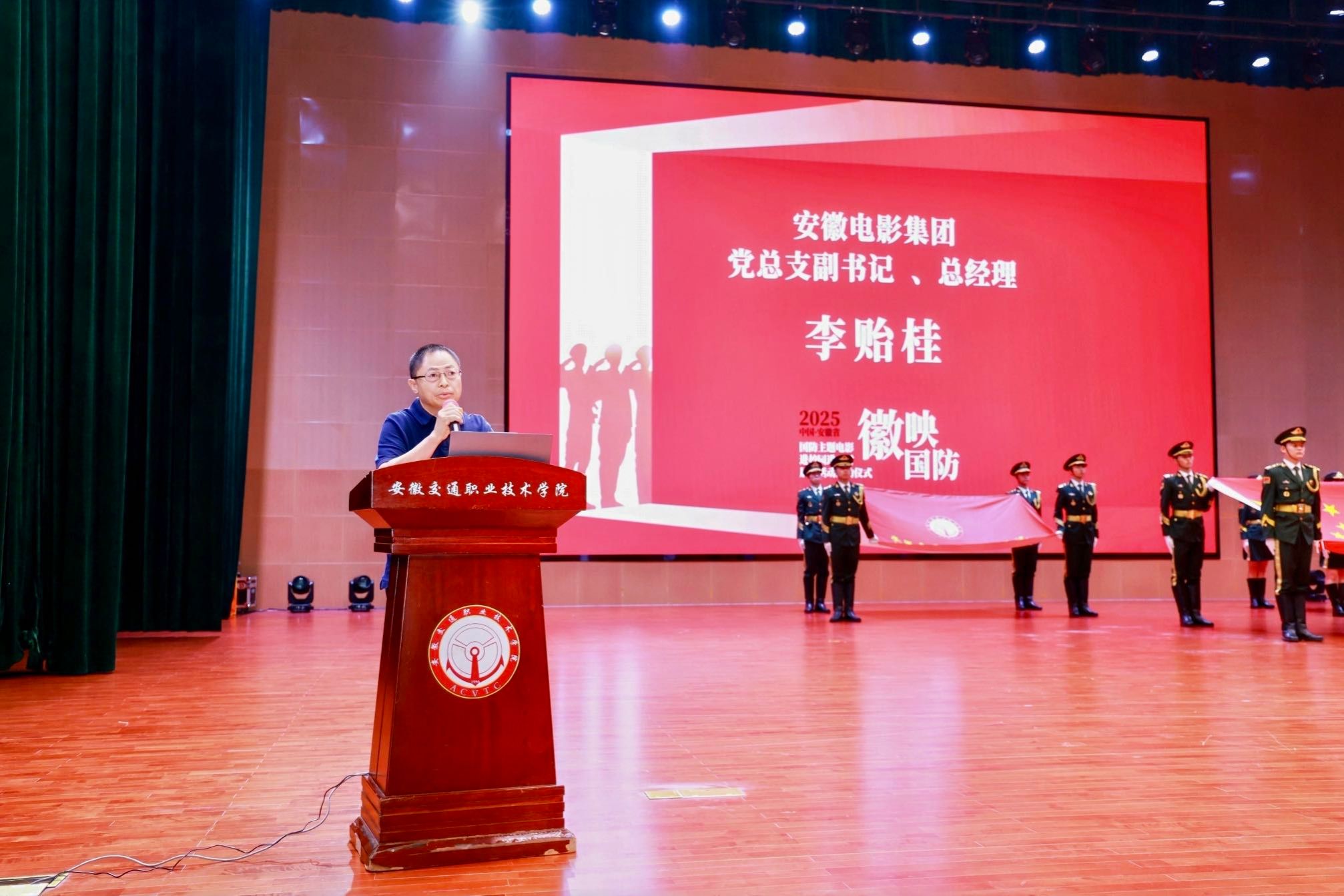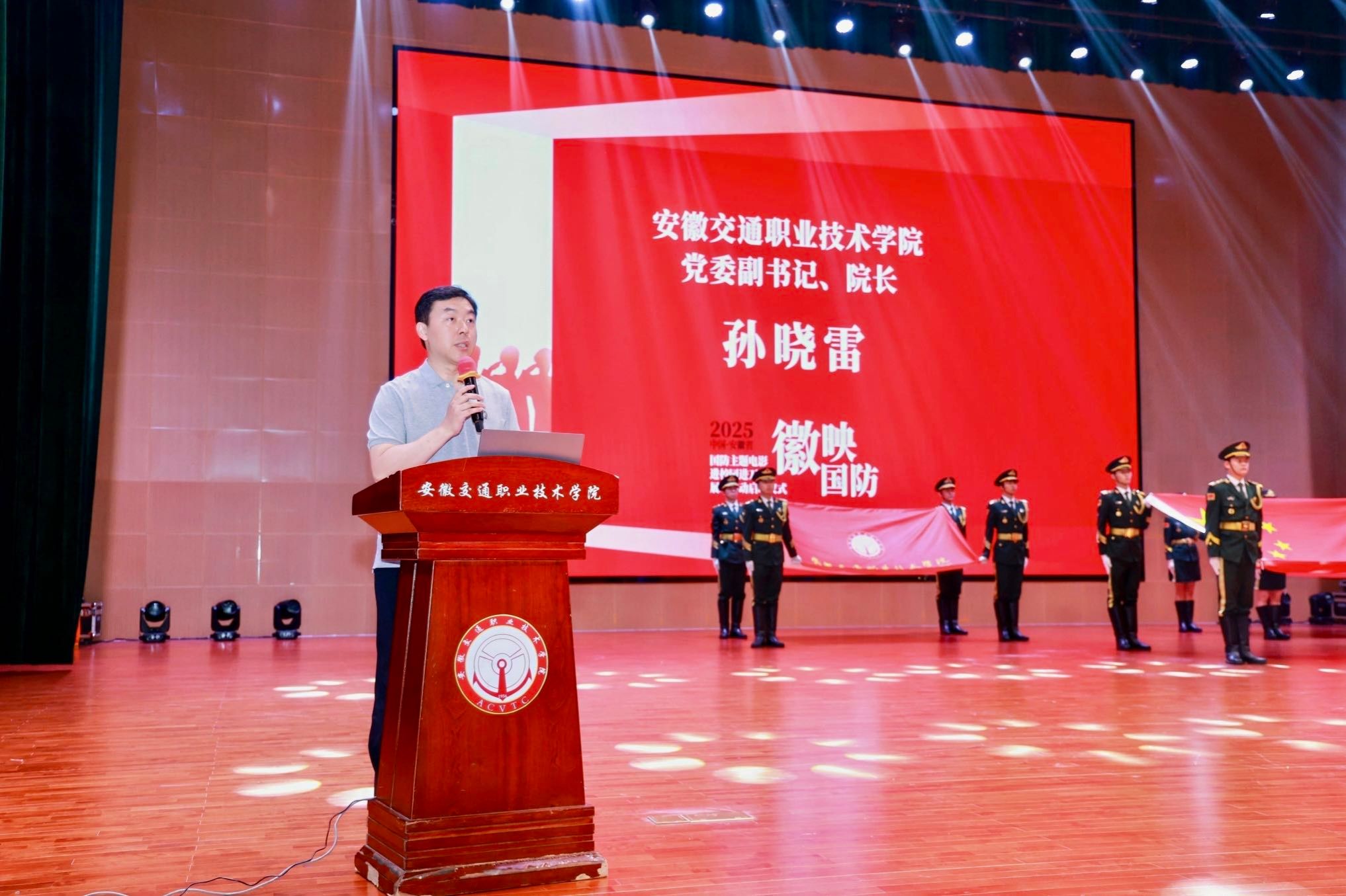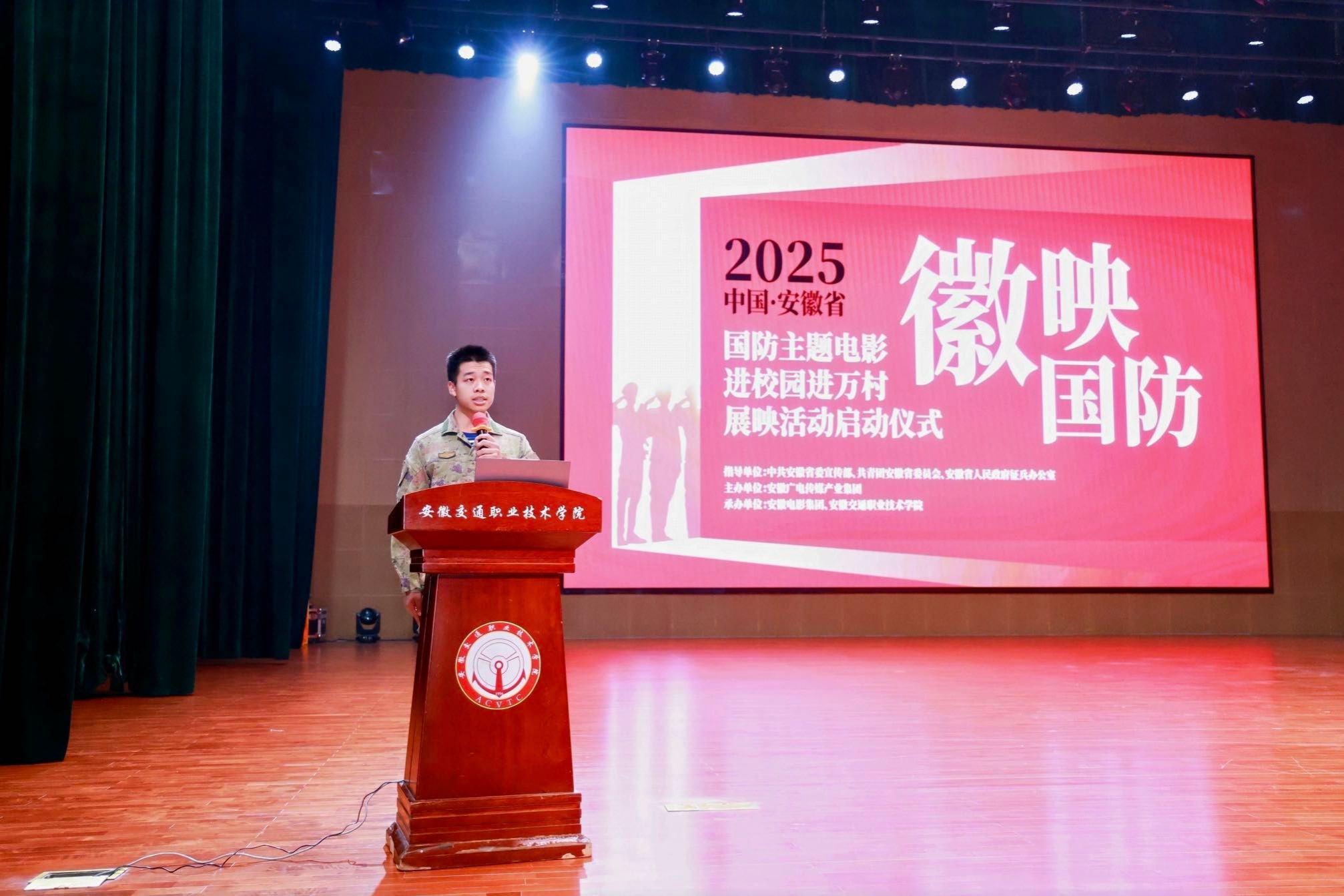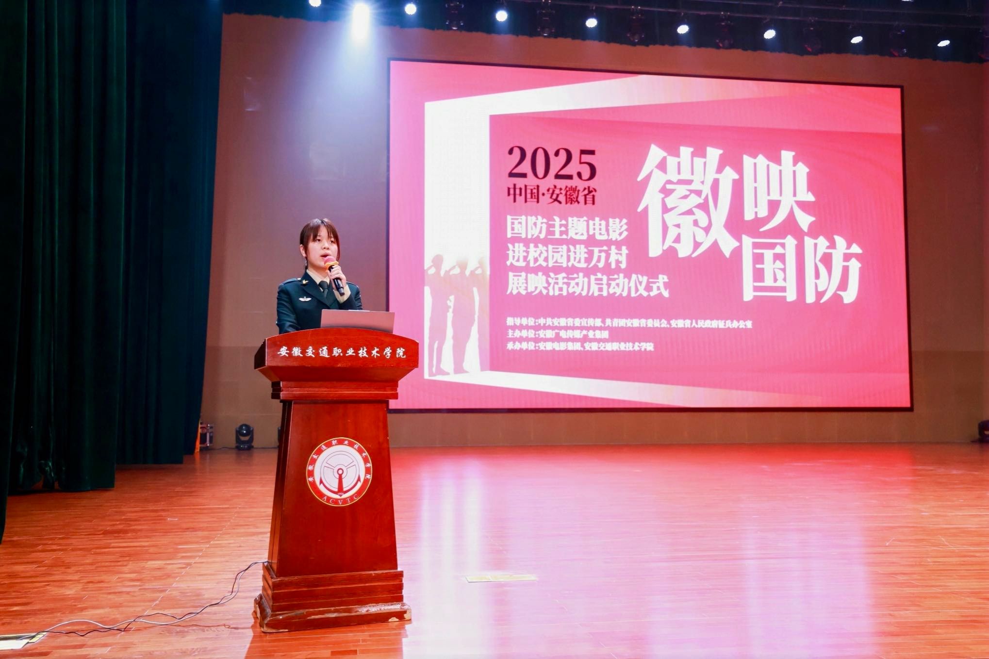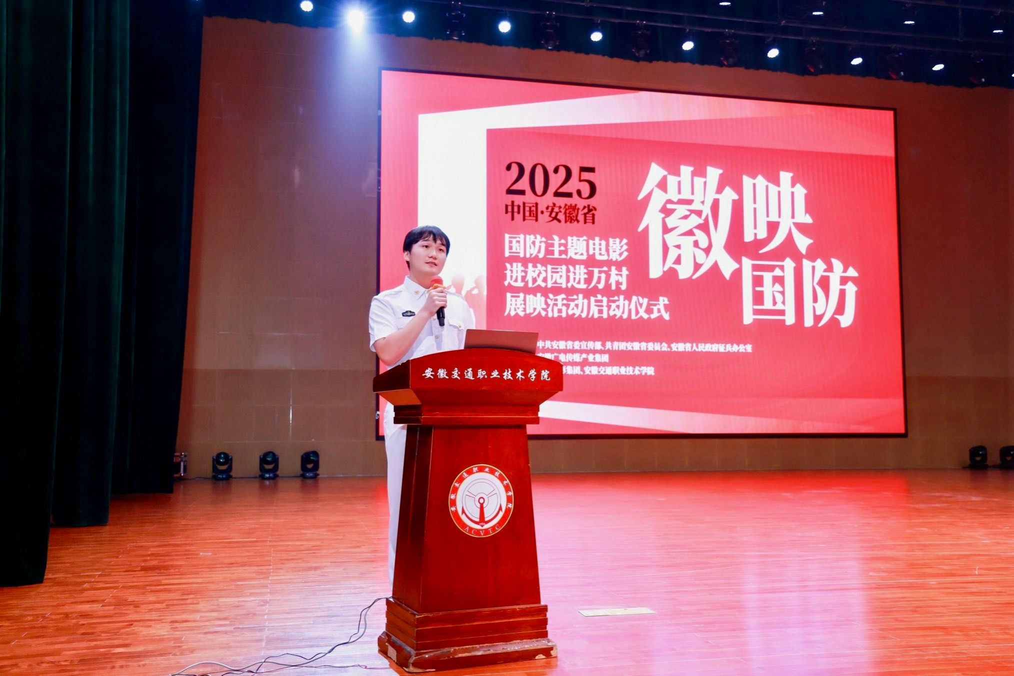 5月29日下午,由中共安徽省委宣傳部、共青團安徽省委員會、安徽省人民政府征兵辦公室指導,安徽廣電傳媒產(chǎn)業(yè)集團主辦,安徽交通職業(yè)技術(shù)學院與安徽電影集團聯(lián)合承辦的2025年“徽映國防”安徽省國防主題電影進校園進萬村展映活動啟動儀式在學院新橋校區(qū)經(jīng)世大禮堂隆重舉行。團省委副書記周宇,學院黨委副書記、院長孫曉雷,省委宣傳部宣教處一級調(diào)研員袁校斌、省征兵辦公室上校參謀張峰、安徽電影集團董事長虞詠等領(lǐng)導嘉賓共同啟動2025年“徽映國防”萬場展映活動。