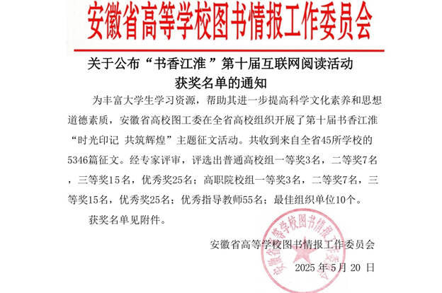 近日,由安徽省高等學校圖書情報工作委員會主辦的"書香江淮"第十屆互聯網閱讀活動圓滿落幕,獲獎名單正式揭曉。我院師生在此次活動中表現優異,斬獲多項榮譽,充分展現了我院師生的文學素養和家國情懷。