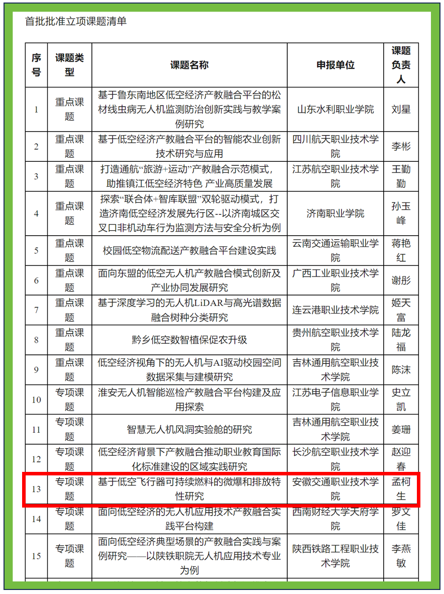 6月3日,全國航空工業職業教育教學指導委員會公布“基于低空經濟產教融合平臺探索高質量成果”課題研究首批立項結果的通知,由我校孟柯生博士牽頭申報的《基于低空飛行器可持續燃料的微爆和排放特性研究》項目獲批立項。