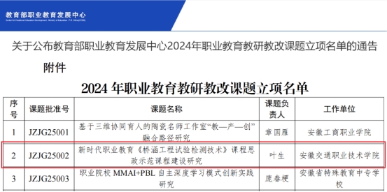6月9日,教育部職業教育發展中心發布了《關于公布教育部職業教育發展中心2024年職業教育教研教改課題立項名單的通告》,我校葉生教授申報的《新時代職業教育(橋涵工程試驗檢測技術)課程思政示范課程建設研究》課題成功獲批立項。