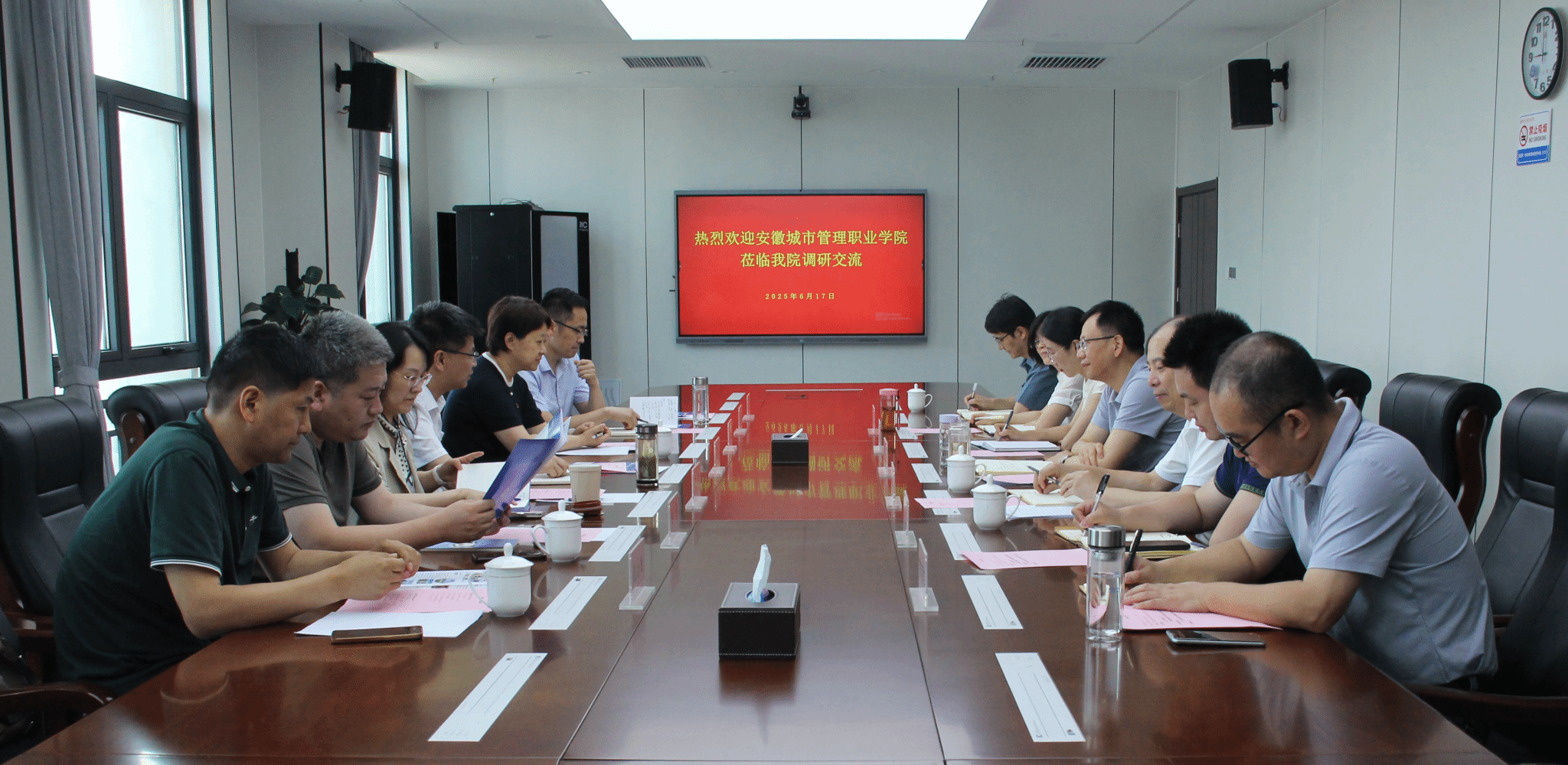 6月17日上午,安徽城市管理職業(yè)學(xué)院黨委書記晏祥一行來我校開展調(diào)研交流,校黨委書記楊菲鈴等校領(lǐng)導(dǎo)及相關(guān)部門負(fù)責(zé)人接待陪同。