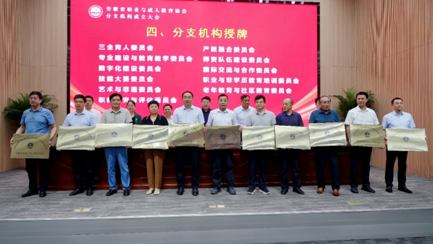 6月11日,安徽省職業與成人教育協會分支機構成立大會在合肥順利召開,會議由安徽工商職業學院原黨委副書記、院長、協會常務副會長李雪主持。我校黨委副書記、校長孫曉雷,作為協會功能型黨支部副書記出席會議,并為分支機構授牌。