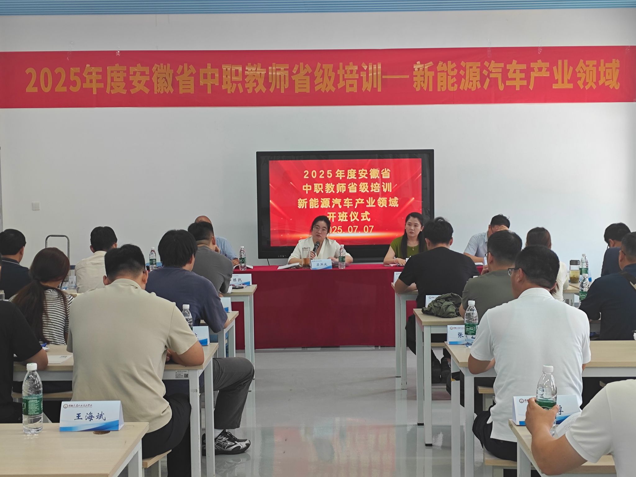 7月7日上午,2025年度安徽省中職教師省級培訓《新能源汽車產業領域》開班儀式在我校舉行。本次培訓由省教育廳主辦、學校承辦,旨在提升中職院校新能源汽車相關專業教師的專業技能與教育教學能力,為安徽省新能源汽車產業發展輸送更多高素質技能人才。安徽省中等職業學校教師繼續教育中心主任張嫻,校黨委委員、副校長梁洪波,汽車工程學院院長湯峰、副院長程章出席開班儀式。儀式由程章主持。