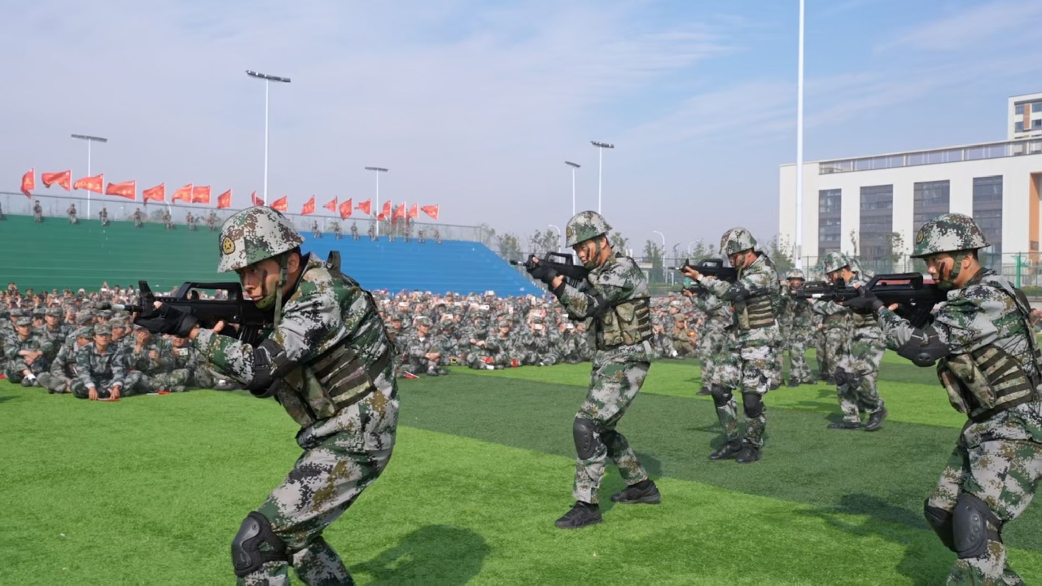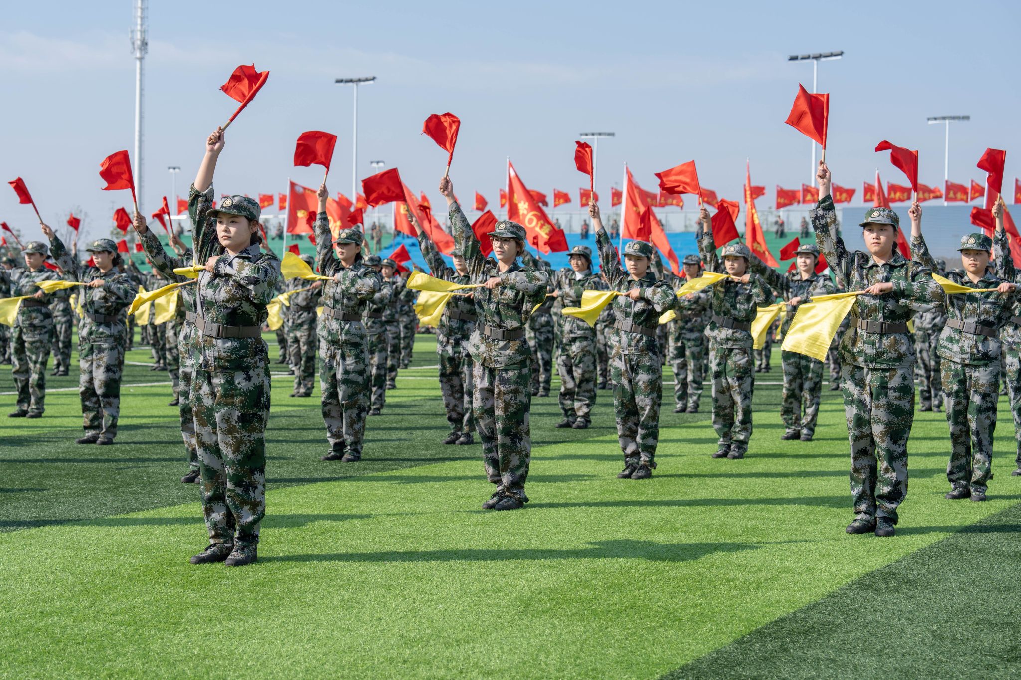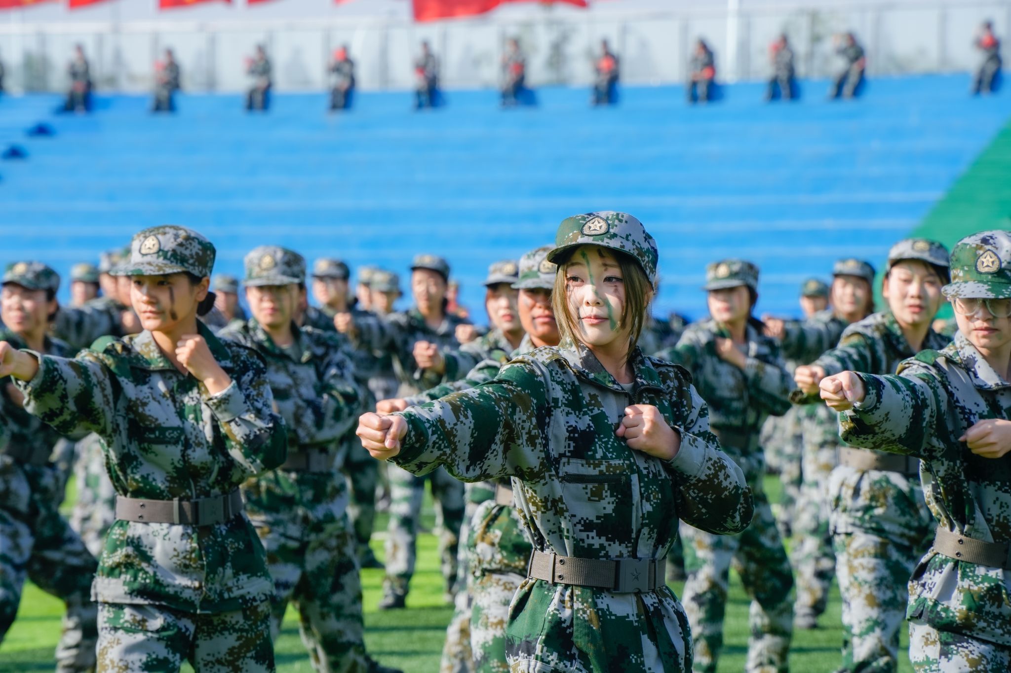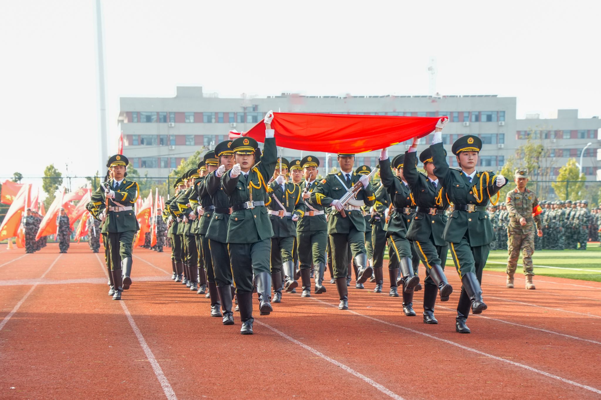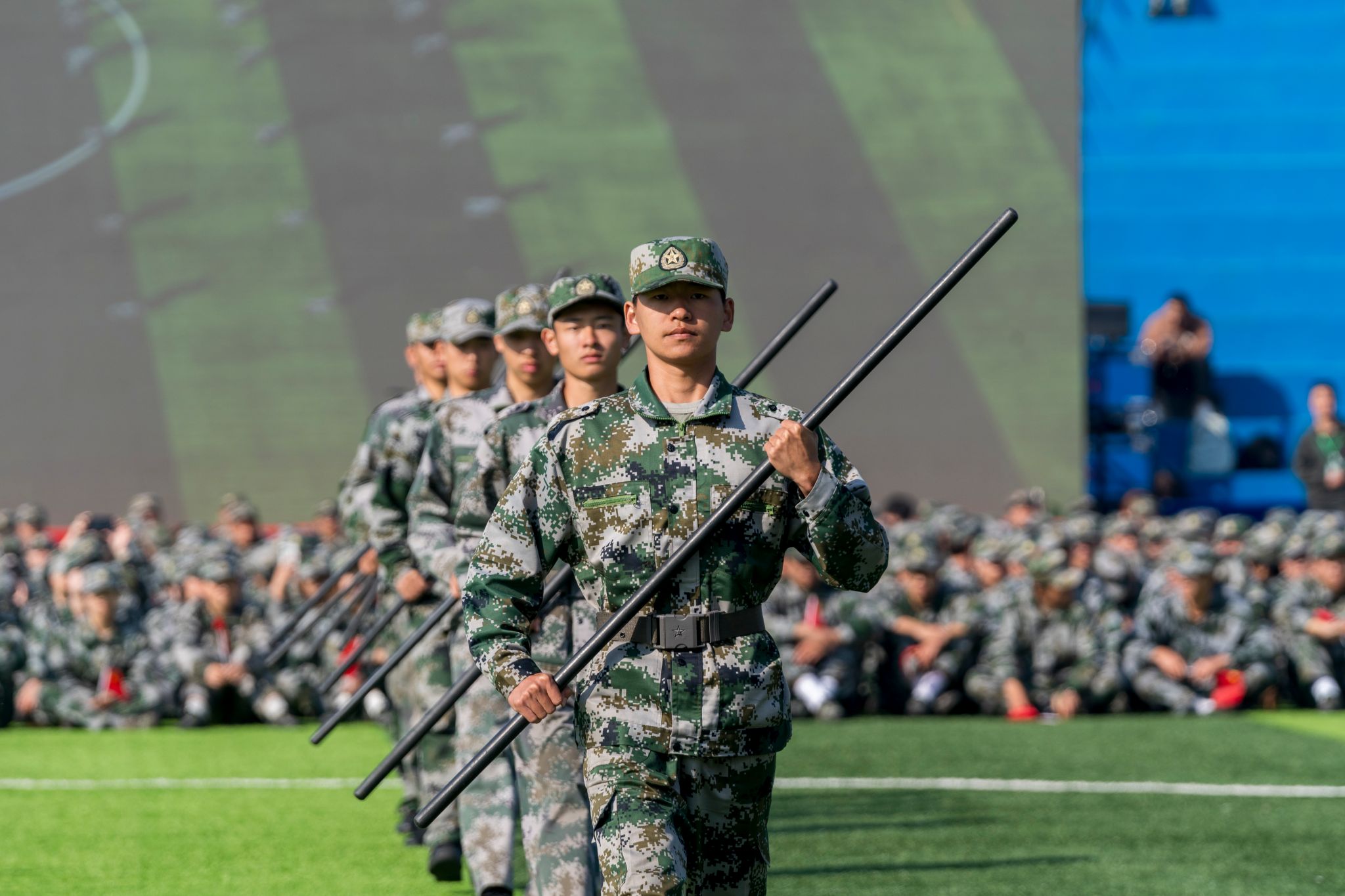 孫曉雷宣布2025級新生軍訓成果展示開始。隨著一聲令下,各方陣在帶隊教官的指令下依次通過主席臺進行分列式匯報展示,隨后隊列會操、旗語操、軍體拳、格斗術、刺殺操、應急棍術、匕首操、打背包、戰術表演等匯報項目接連上演,鏗鏘有力的步伐、整齊劃一的動作、意氣風發的斗志,震撼全場,令人熱血沸騰。