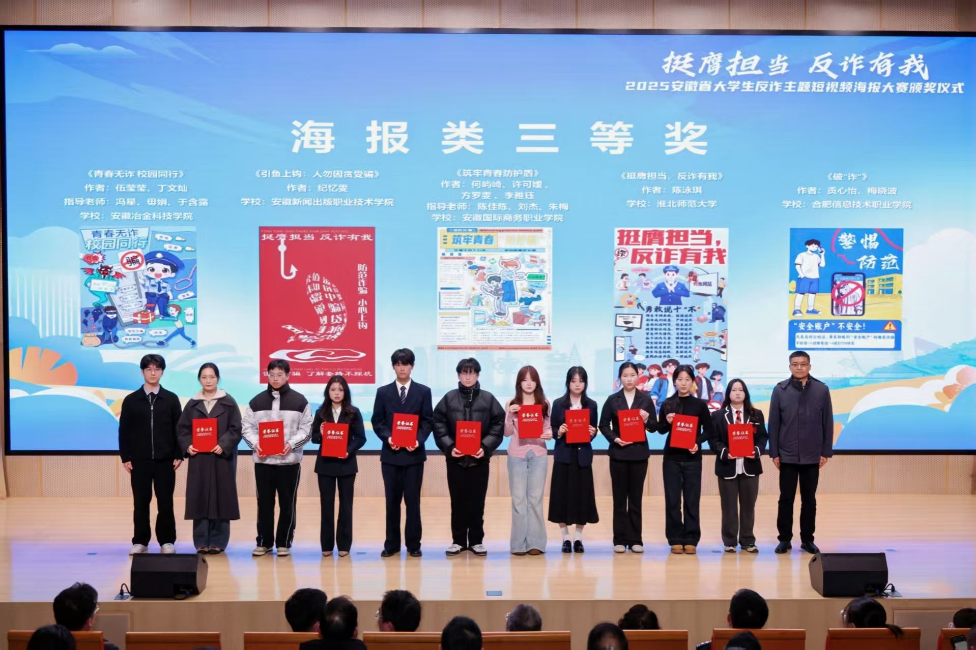 近日,我校郝涵雨、李俊豪、白昕宇3名同學組成的創作團隊,在由安徽省通信管理局、安徽省公安廳、安徽省教育廳、共青團安徽省委員會、安徽省學生聯合會聯合主辦的2025年 “安徽省大學生反詐主題短視頻海報大賽”中,憑借平面設計作品《這場 “游戲”,你永遠贏不了》,以其新穎獨特的創意構思、扎實精湛的專業技能、深刻鮮明的反詐內涵,在全省眾多參賽作品中脫穎而出,獲得海報類三等獎。