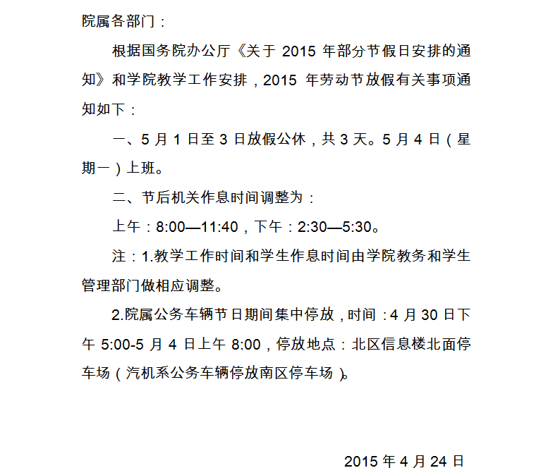關(guān)于2015年勞動(dòng)節(jié)放假的通知
