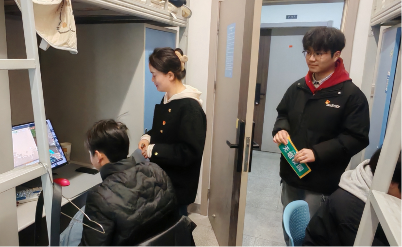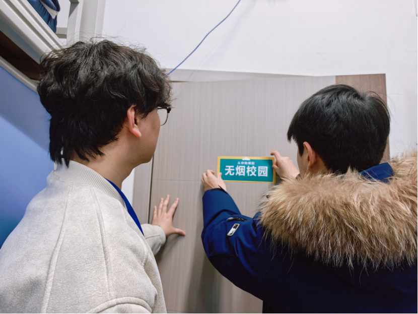 在走訪過程中,師生們還同步開展“標識上墻”行動——學生黨員與志愿者協(xié)作,在重點宿舍的門上、墻面顯眼處張貼“無煙校園”主題標識牌。這些標識如同“無聲的監(jiān)督員”,時刻提醒同學們守護無煙環(huán)境、嚴守用電安全,讓文明規(guī)范從“口頭倡議”轉化為“空間約束”,為宿舍文明建設注入長效機制。