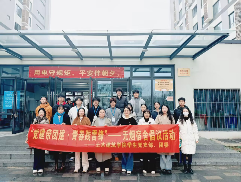 為深入貫徹新時代校園文明建設要求,弘揚雷鋒精神,強化學生宿舍安全與健康管理,土木建筑學院學生黨支部聯(lián)合團委于3月18日開展“黨建帶團建·青春踐雷鋒”無煙宿舍倡議活動。學院黨總支副書記王佳賓、學生黨支部教師黨員和學生黨員、團員志愿者共同參與,以宿舍為切入點,通過實際行動踐行“無煙校園”的理念。