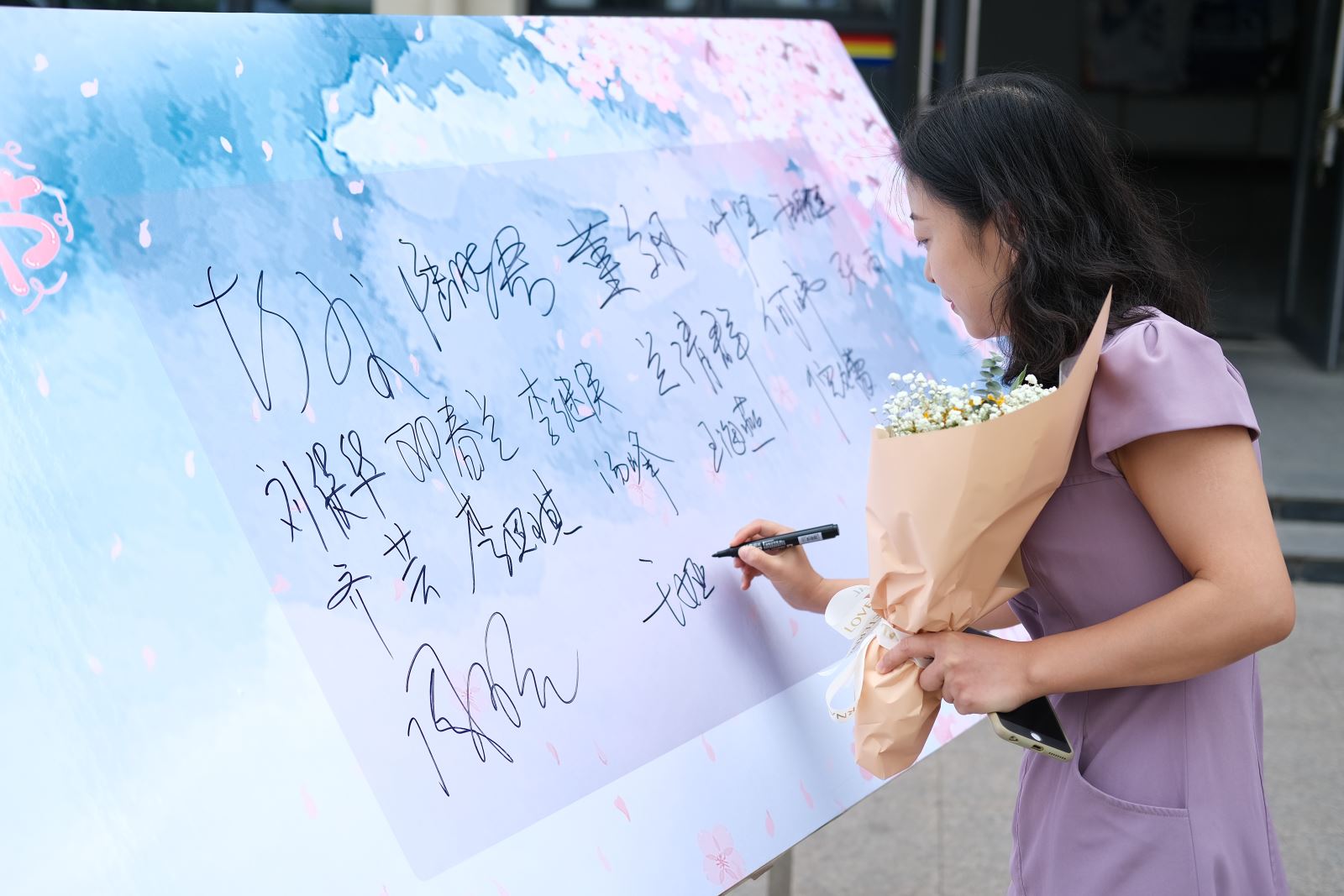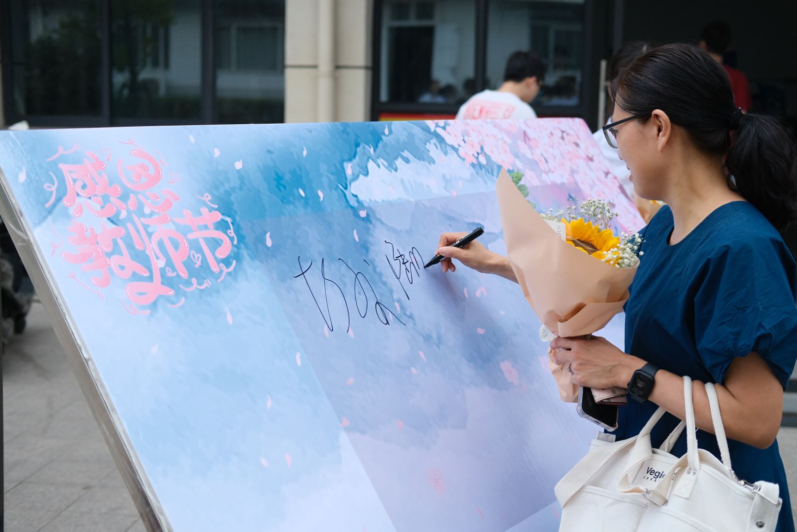 溫暖人心的祝福語透過一張張卡片,那是同學(xué)們對老師們的祝福,對老師們情誼的訴說,一筆一劃中厚植愛國情懷,涵養(yǎng)高尚品德。老師們也在祝福墻上留下簽名、記錄下最美的身影,師生同頻共振,相得益彰。
