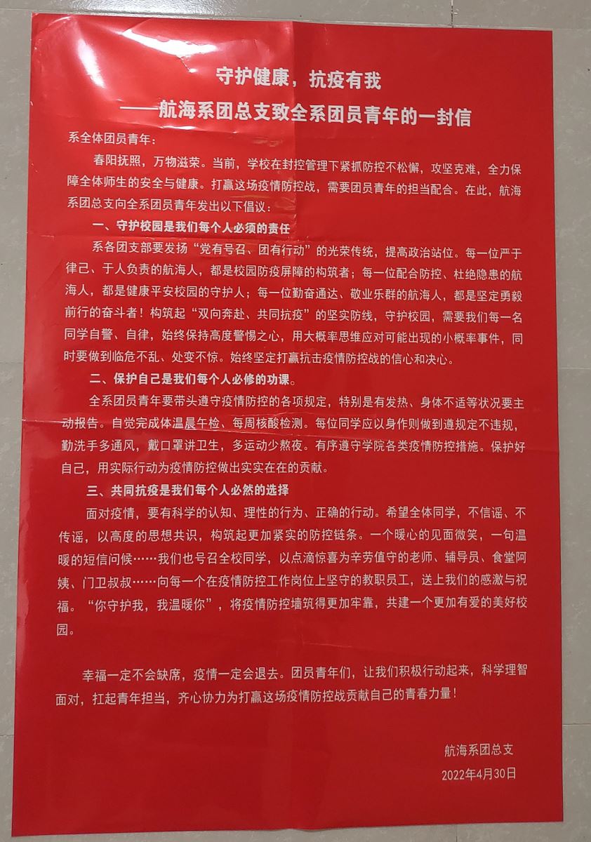 5月1日航海系團總支通過微信公眾號發布《守護健康,抗疫有我--致全系團員青年的一封信》,并在學生生活區、公示欄張貼。要求航海系各團支部、全系團員青年充分展現黨的助手和后備軍的擔當,充分展現青年生力軍和突擊隊的作為,挺身而出,積極配合校園疫情防控措施,為堅決打贏疫情防控阻擊戰貢獻力量。