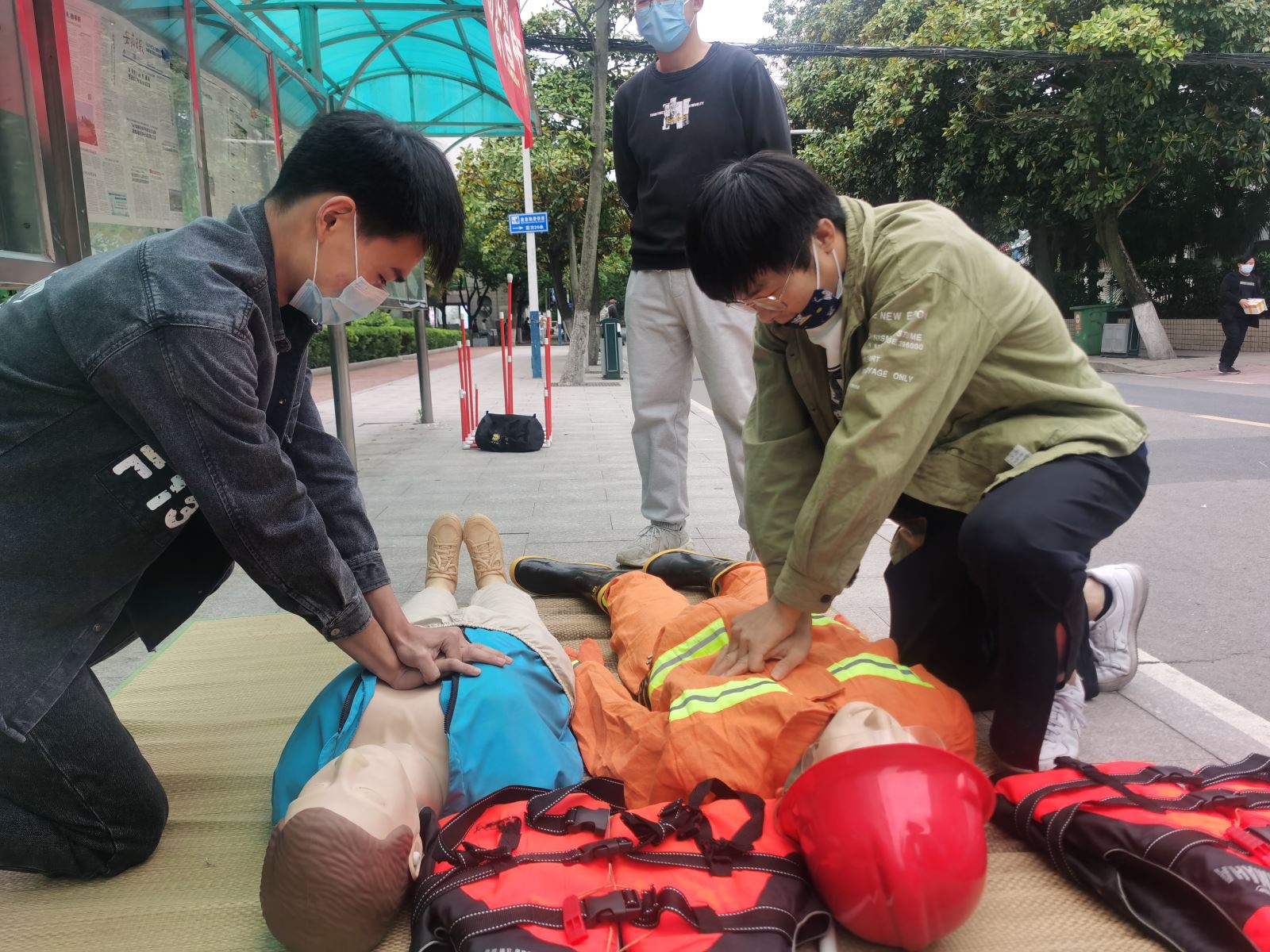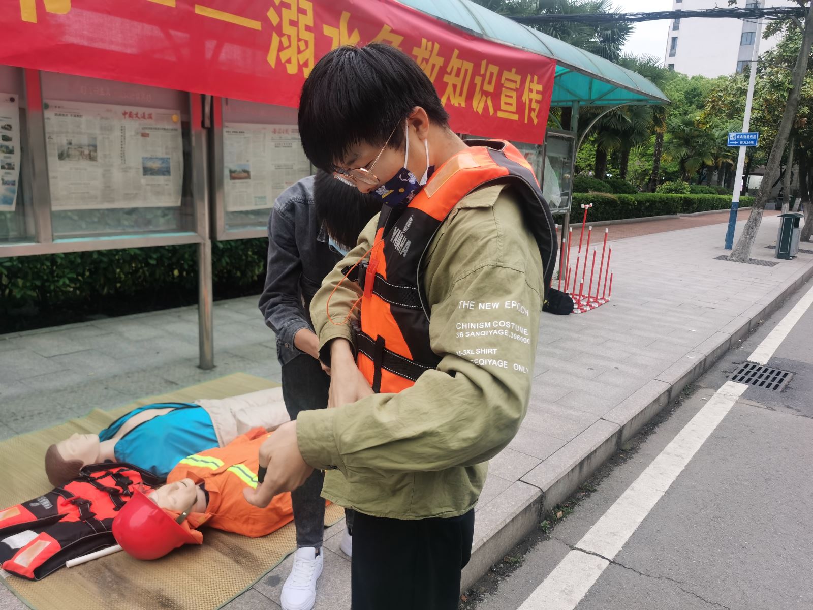 在教學樓門口,航海系學生運用所學航海急救知識,詳細為大家宣講了防溺水常識和應急救護知識,并在現場就自救互救、救生衣的穿法、心肺復蘇和海姆立克急救法等安全急救常識及技能與圍觀同學進行了互動教學。本次活動豐富了學校防溺水安全教育手段,提高了學生自我防護意識和應急自救能力。