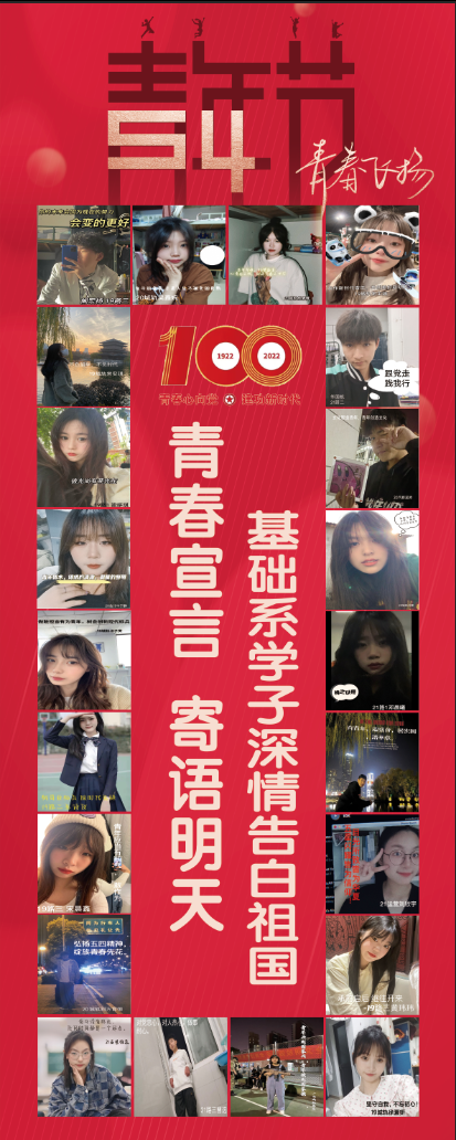 為慶祝建團100周年、迎接黨的二十大勝利召開,落實“從黨史學習中激發信仰、獲得啟發、汲取力量”的要求,基礎系團總支在五四青年節之際組織開展“青春宣言 寄語明天”活動。