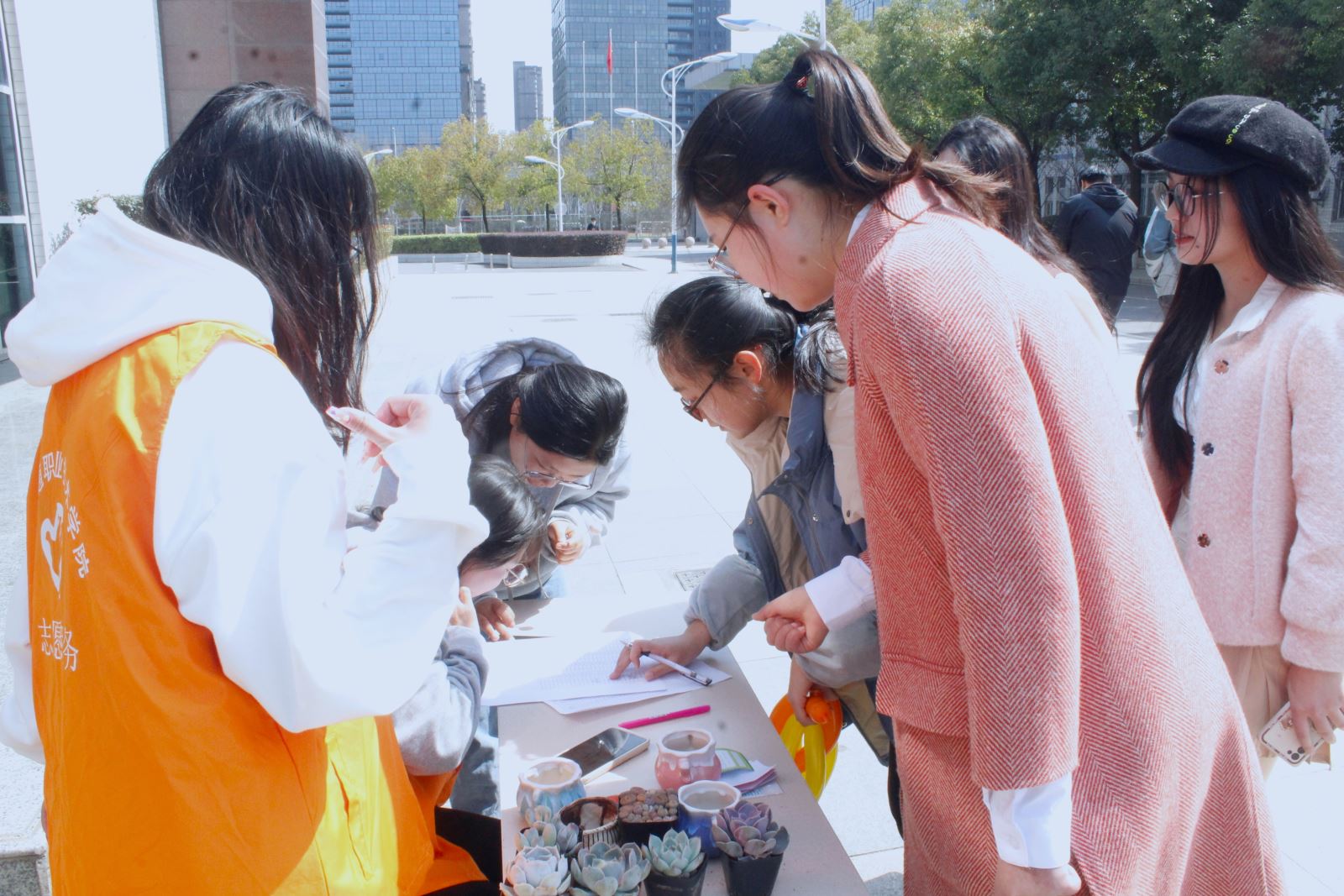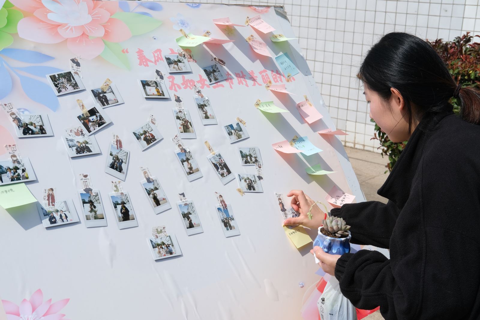 在多肉盆栽DIY環節,志愿者隊參加活動的女生講授如何培養多肉植物,并進行別具一格的多肉植物DIY活動。廣大女生圍坐一起,手持小工具饒有趣味地制作起來。剖土、栽種、鋪石、裝飾……每個人都樂在其中。女同胞們變身巧手花匠,盡情釋放自己的想象力,打造各具特色的“純手工盆景”,待種植完成可合影留戀并在膠卷照片上寫下寄語。隨后,志愿者介紹了多肉植物的生活知識、習性特點,同時就澆水、日照等生活中常見的問題作了較為實用的講解,活動在喜悅的氛圍中圓滿落幕。