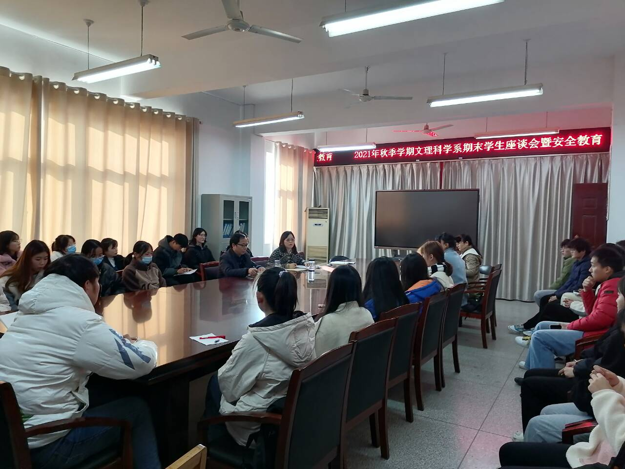 為進一步強化同學們的紀律觀念和安全防范意識,規范同學們的日常行為,切實加強安全教育管理和安全穩定工作,文理系于12月23日召開期末學生座談暨安全教育大會。系黨總支副書記、副主任(全面主持工作)昌希燦、系黨總支副書記、副主任王玨,以及負責學生管理的老師、輔導員參加會議。