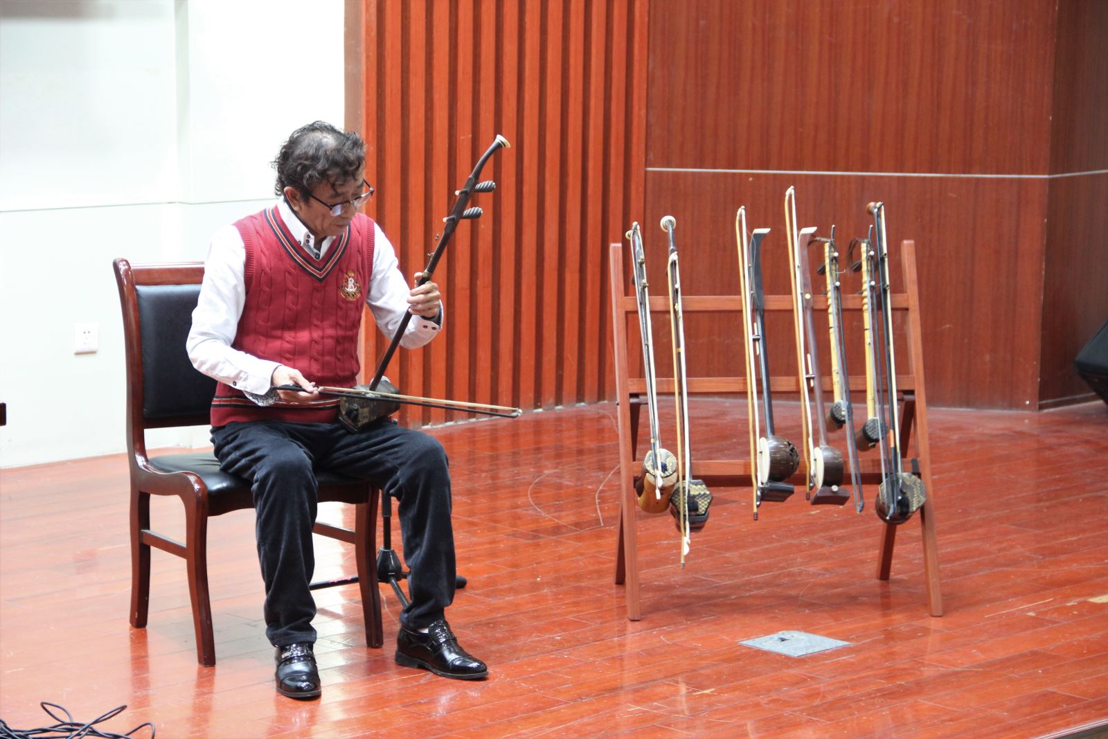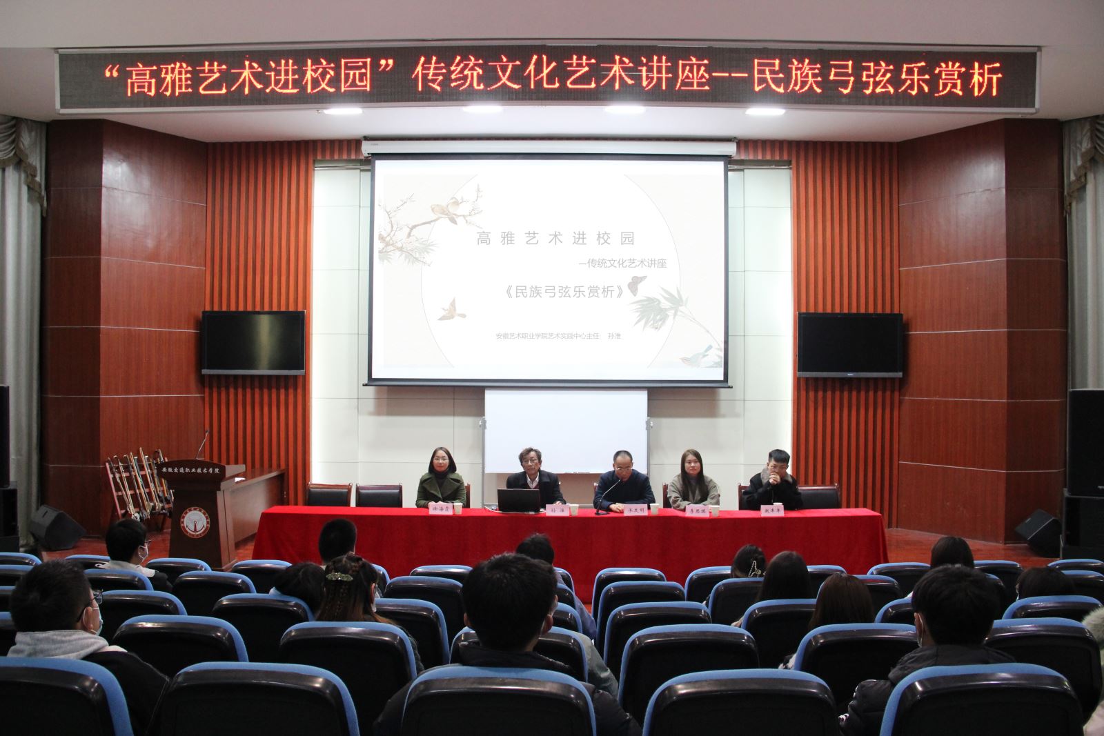 孫淮以“中國傳統民樂的發展歷程”為脈絡,闡述了民族弓弦器樂在歷史發展進程中的興衰和變革,孫淮一邊詳細講解中國民族弓弦樂器的結構和簡單技法,一邊為學生帶來經典的民樂作品賞析,引領在場聽眾感受民族傳統音樂的藝術魅力。他鼓勵學生在學習專業知識的同時,要加強藝術修養,把人文與技能融合,讓高雅藝術常伴左右,從中華優秀傳統文化中汲取營養,使自身的審美情趣、藝術修養得到更好地提升。