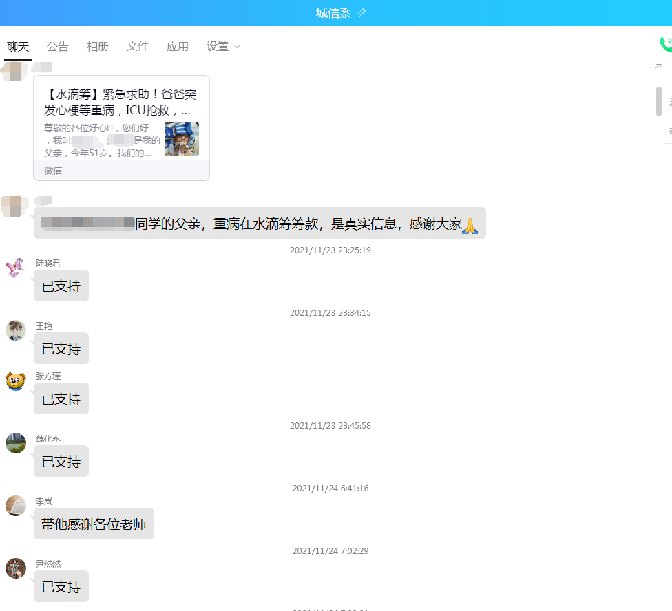 11月22日,城信系一名學生的父親突發嚴重疾病,因家境貧困,急需高額治療費,該同學的不幸遭遇和困難牽動著領導和廣大師生的心。“一方有難,八方支援”。23日,城信系黨總支研究決定開展“我為師生辦實事”愛心募捐活動,向全系師生發起倡議,為患病的同學父親捐款。活動發起后,全體師生積極響應,通過滴水籌的方式進行線上捐款,用愛心點燃希望,真情傳遞溫暖,譜寫了一曲愛的樂章。
