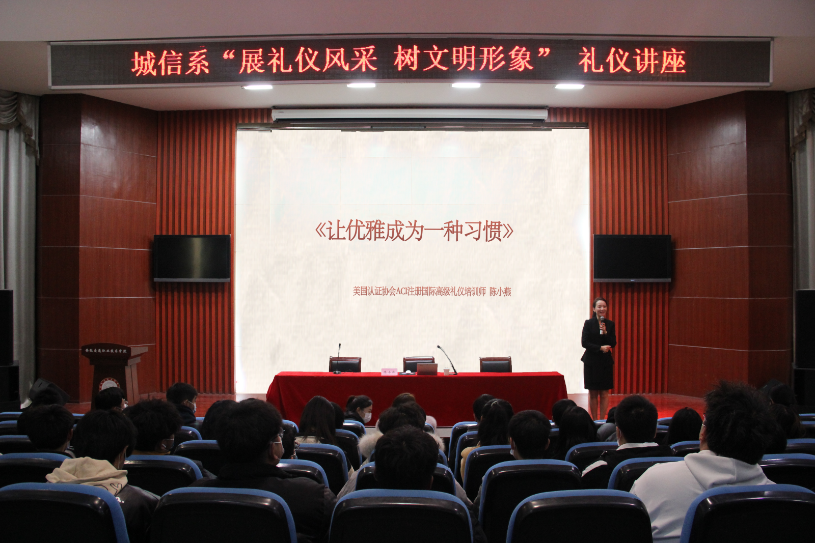 “人無禮則不立,事無禮則不成,國無禮則不寧”。為增強學生文明禮儀修養,全面提升學生的綜合素質,城信系于12月1日晚特邀美國認證協會ACI注冊國際高級禮儀培訓師陳小燕在學院八角樓開展禮儀講座,系20、21級學生代表參加講座。