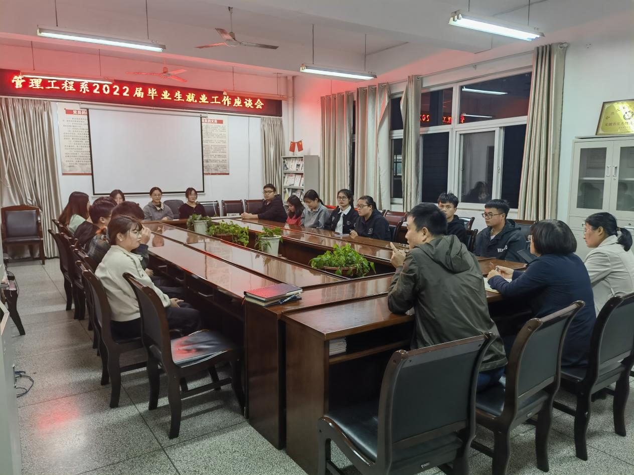 10月11日晚,管理系在會(huì)議室召開2022屆畢業(yè)生就業(yè)工作座談會(huì),系黨總支書記汪思曼、副主任岳朝暉(主持工作)、主任輔導(dǎo)員汪莉、學(xué)生管理辦公室老師姜薇以及2022屆畢業(yè)班各班代表參加就業(yè)座談會(huì)。