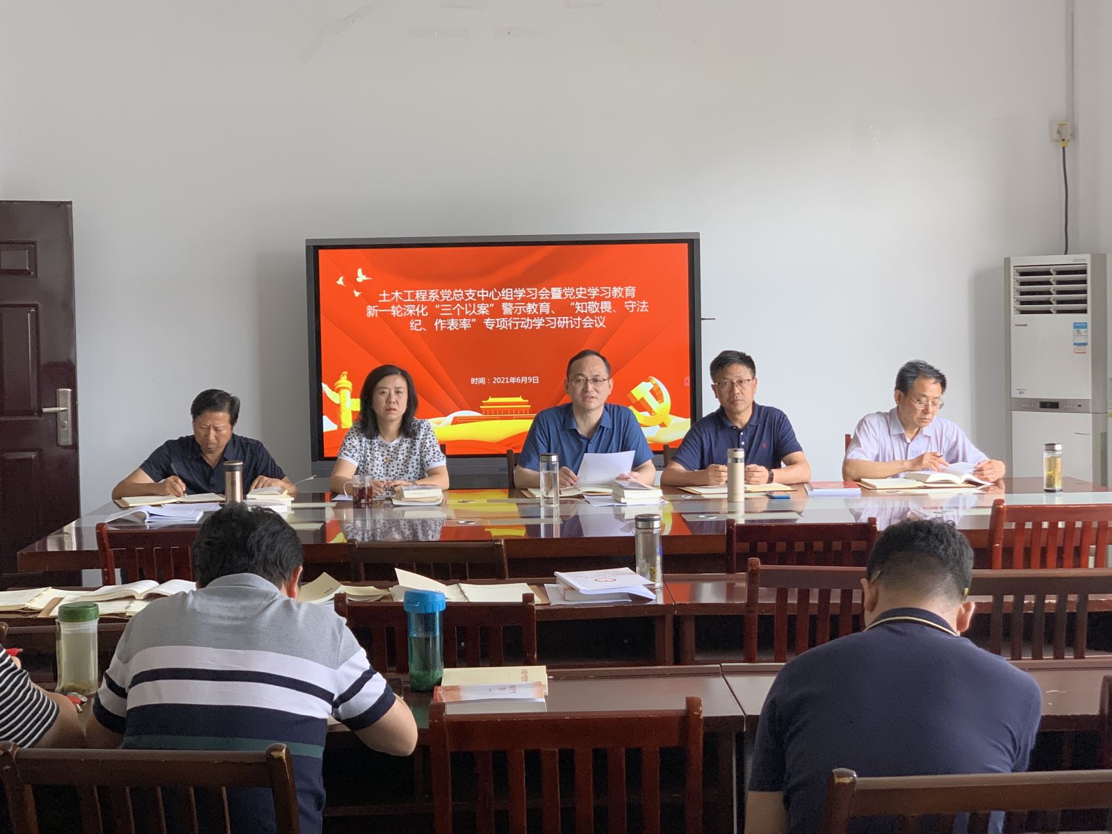 為大力發揚紅色傳統、傳承紅色基因,推進黨史學習教育走深走實,進一步堅定黨員不忘初心、牢記使命的決心和信仰,不斷推進“知敬畏、守法紀、作表率”專項行動,6月9日下午,土木系黨總支圍繞“學史崇德”和“知敬畏、守法紀、作表率”專項行動2個主題舉行學習研討,系領導、副科級以上干部、各支部書記參加交流。