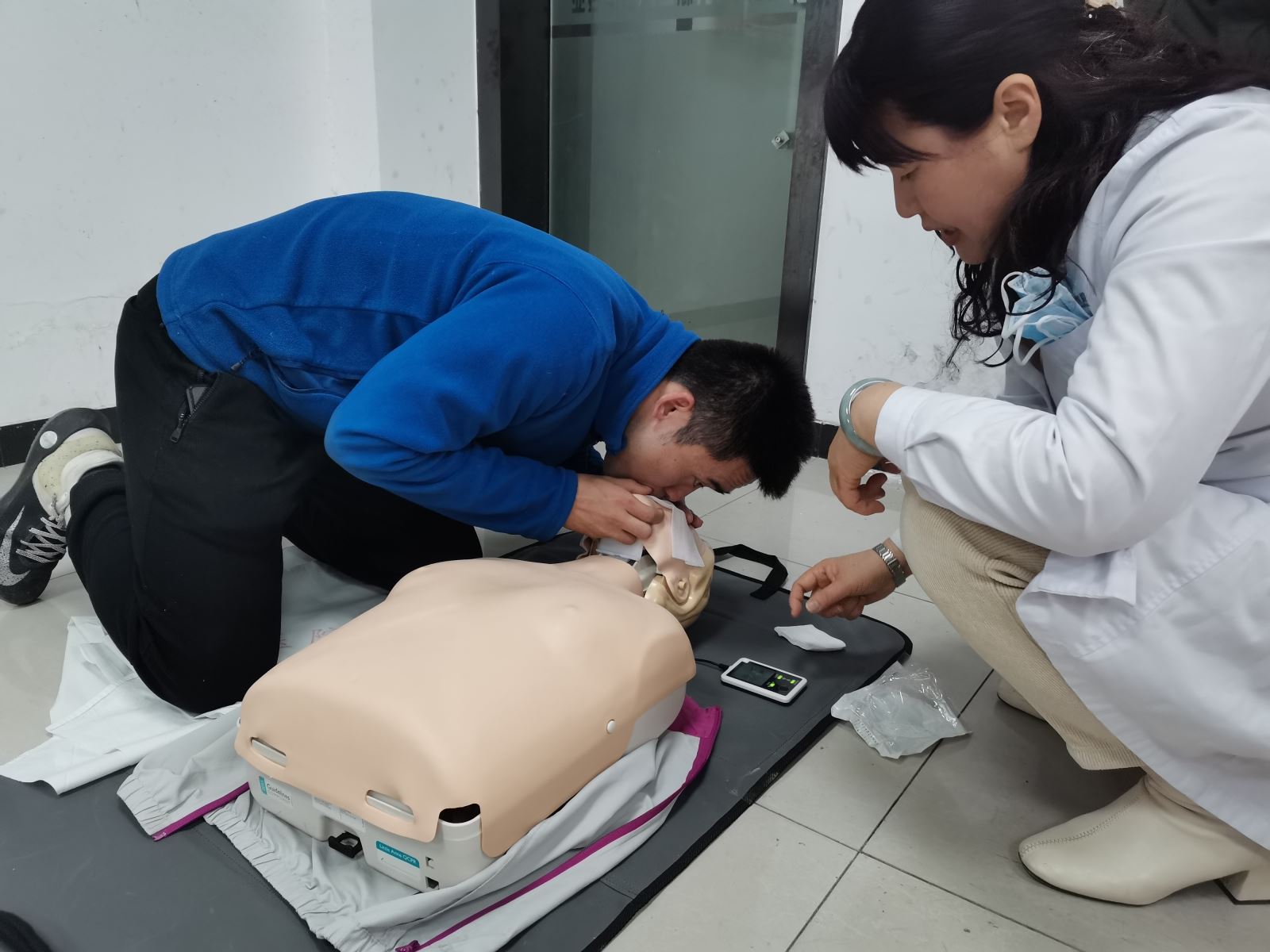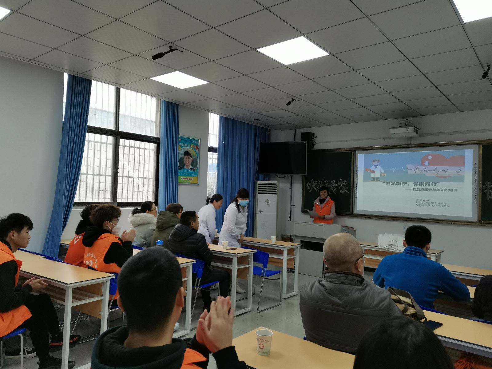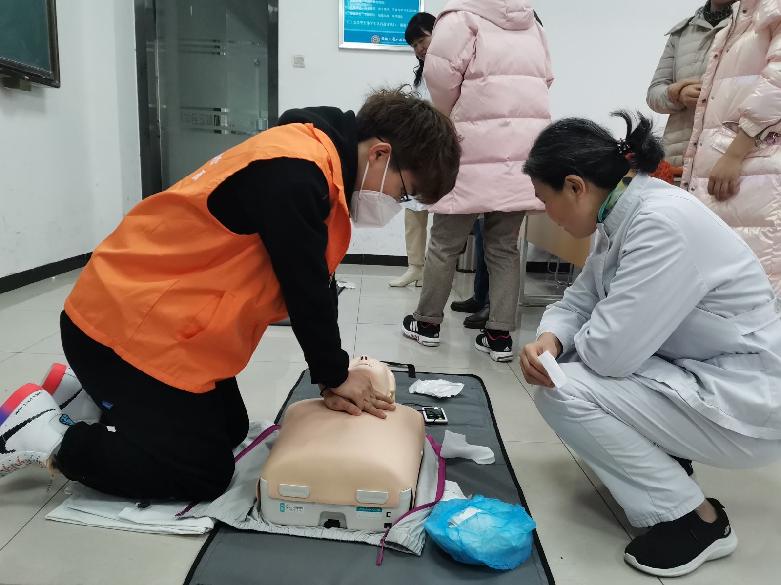 本次活動邀請了中科大附屬第一醫院鮑云霞、王貴梅兩位專家進行授課,采用理論教學和實踐操作相結合的方式,就CPR心肺復蘇急救措施、氣道梗阻等基本急救知識進行系統全面的講解。隨后,在場黨員教師與學生在專家的指導下,分組進行練習。