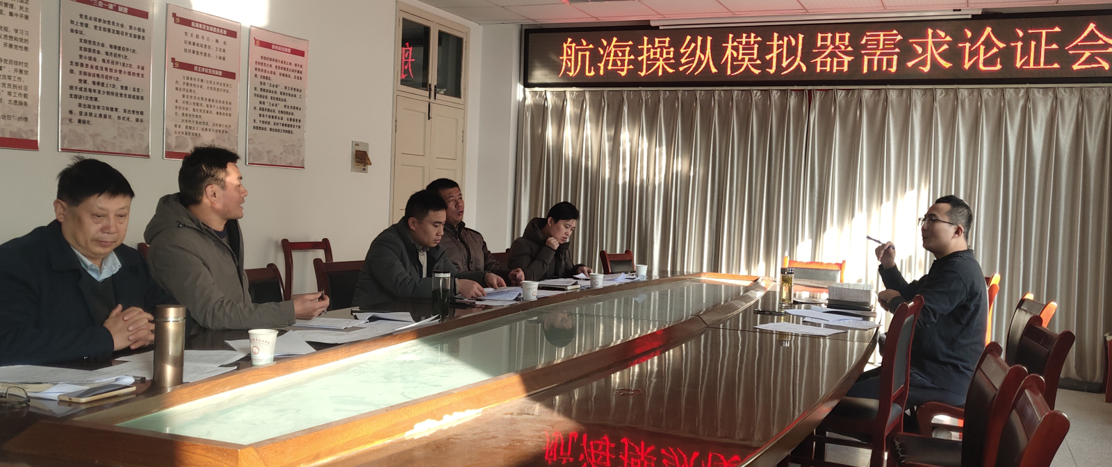 12月16日下午,航海系在系會議室召開了“大型船舶操縱模擬器需求”論證會。安徽中澳科技職業技術學院資產處主任周文山、中國海運集團廣州分公司遠洋船長王小雷、院財務處長龔禎、航海系副主任王在高及梁金華船長參與論證。