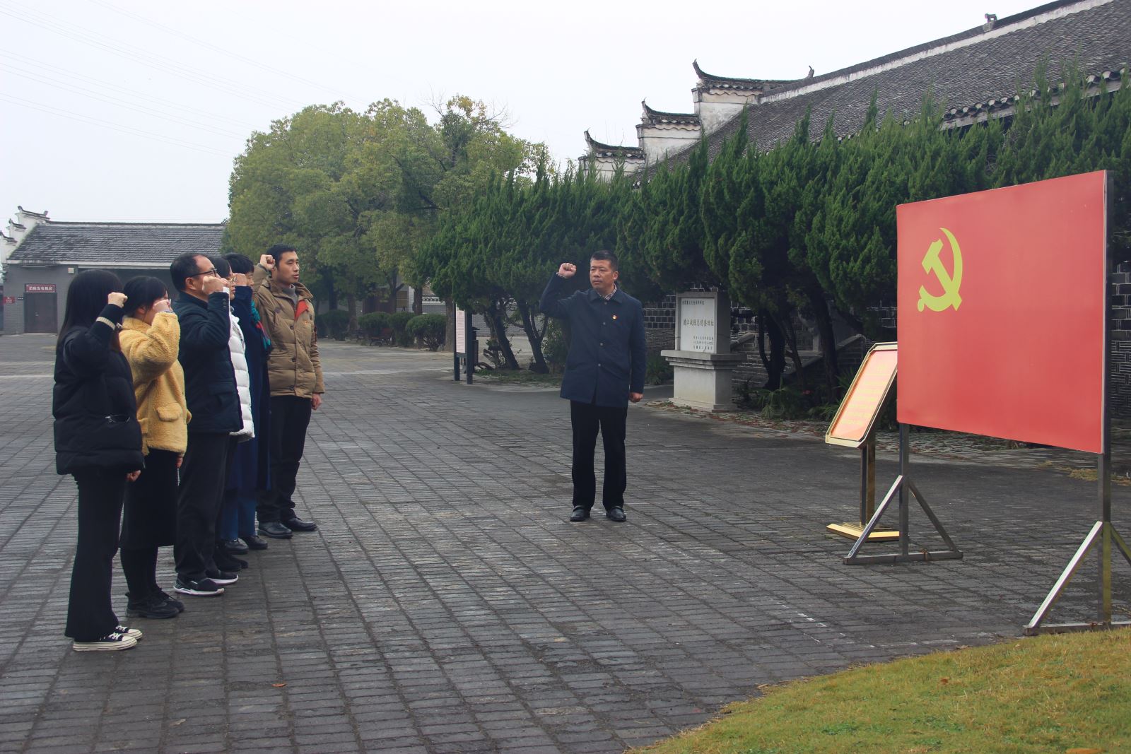 在渡江戰役總前委舊址紀念館的廣場上,黨支部書記龔楨帶領2位新黨員和其他老黨員面向黨旗,舉起右手,莊嚴承諾,共同宣誓。