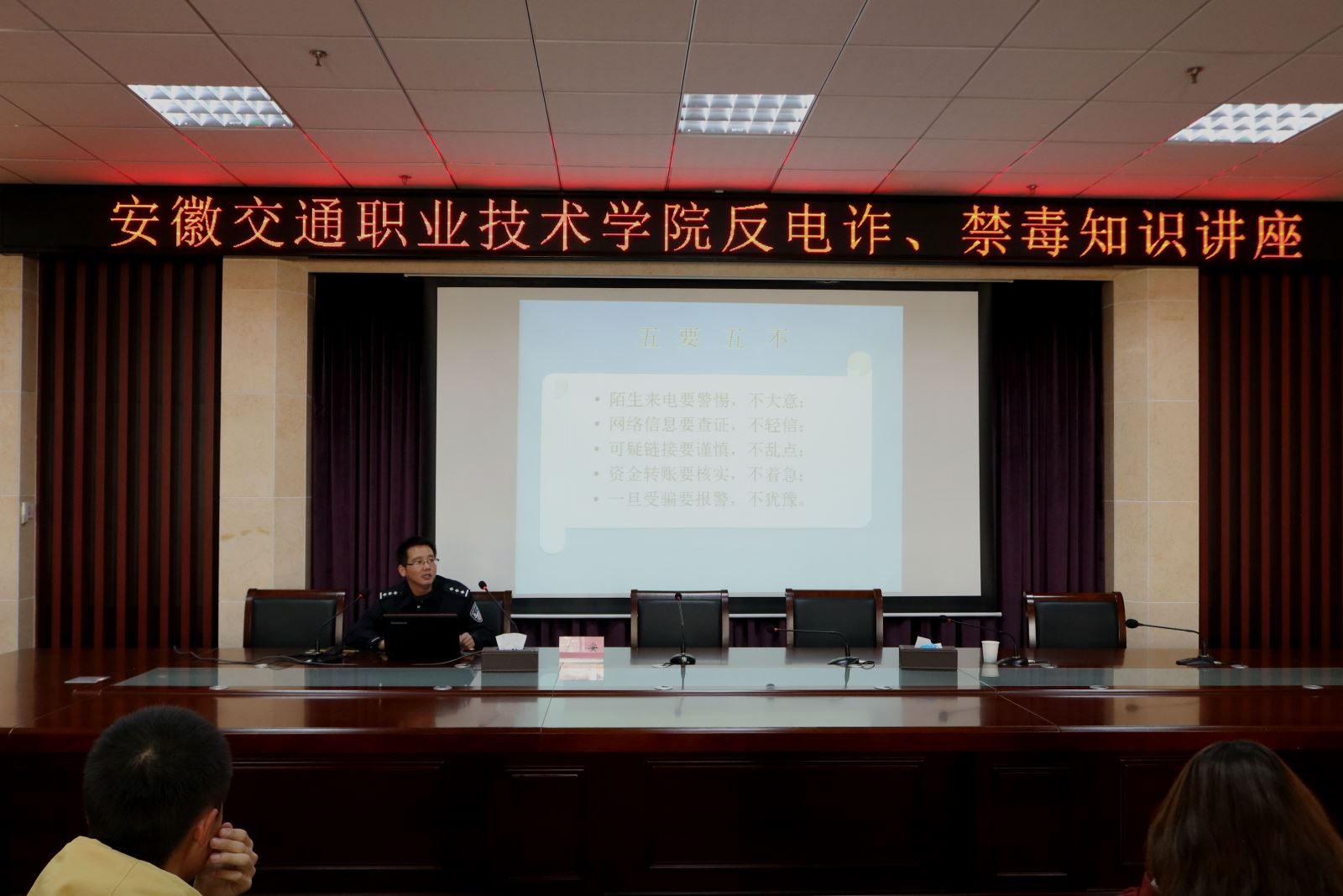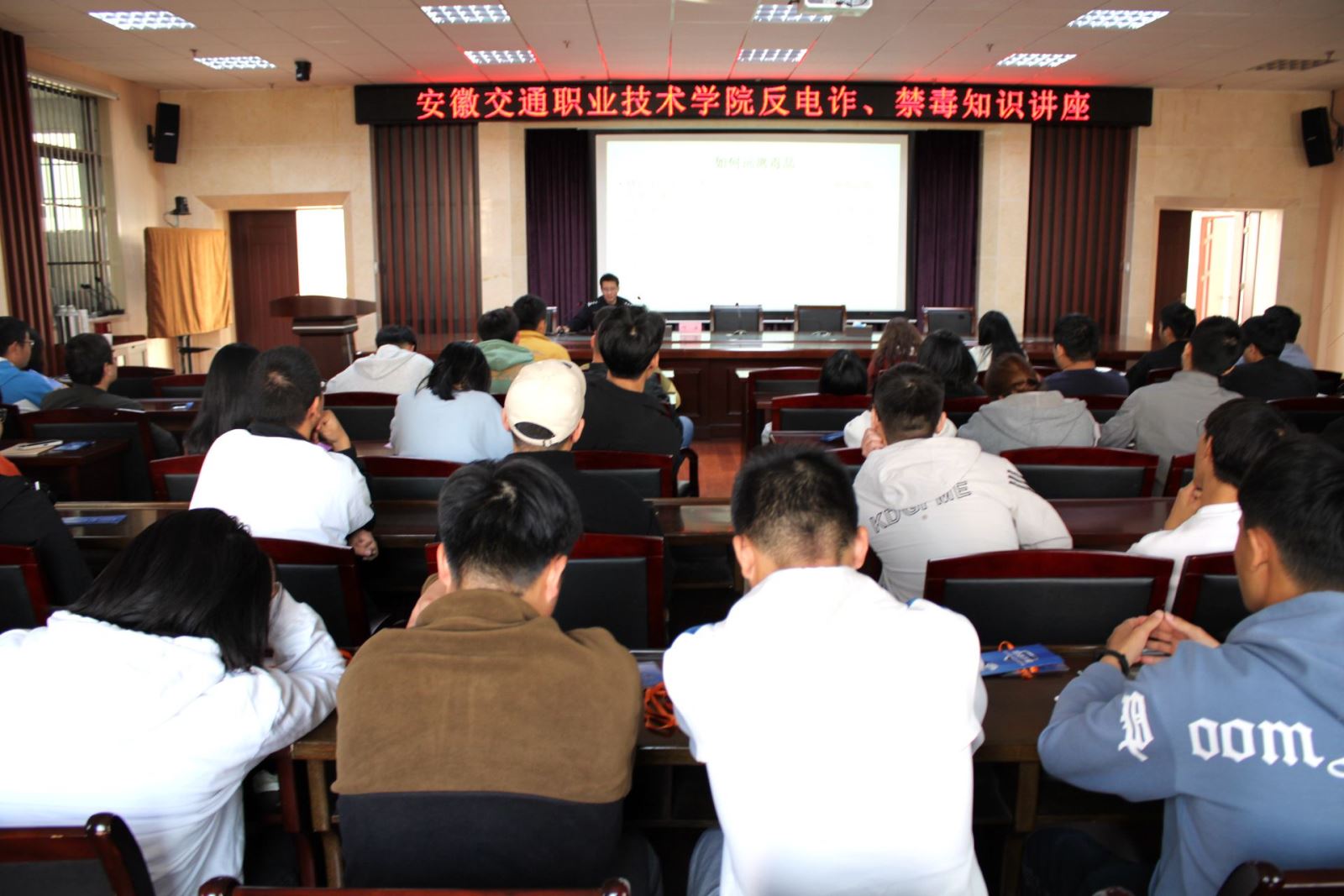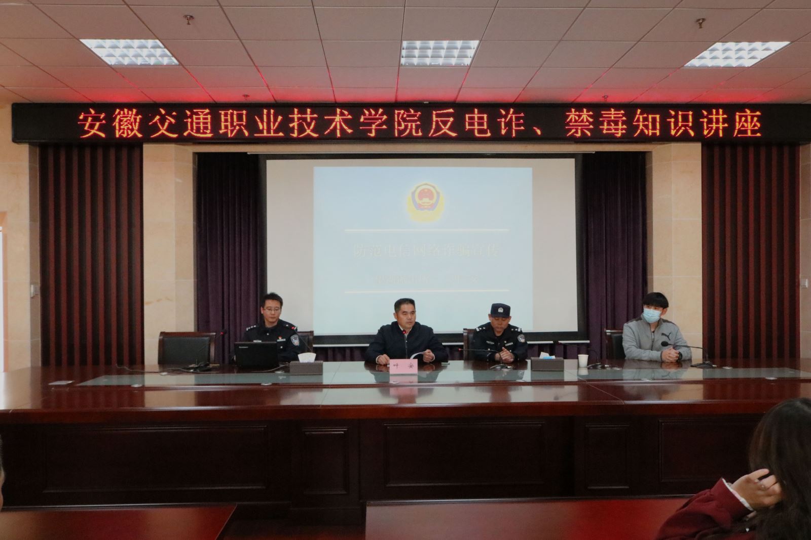 為豐富大學生防騙知識,學習一定的防騙思維和技巧,遠離、抵制毒品,11月9日下午,學院保衛處聯合望湖派出所在信息樓舉辦反電信詐騙、禁毒知識講座。望湖派出所葉安警官主講。保衛處處長袁大方主持。
