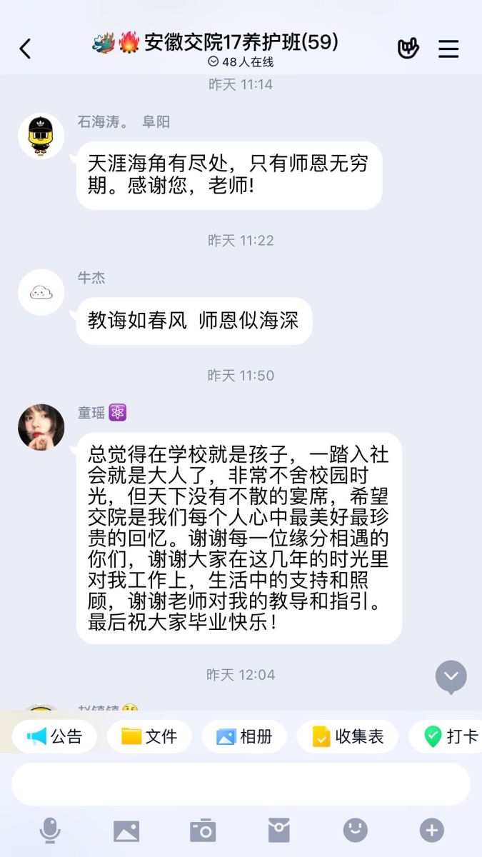 畢業(yè)生離校期間,各班級輔導(dǎo)員積極配合,利用新媒體平臺,通過網(wǎng)絡(luò)召開畢業(yè)班會,廣泛進行征兵宣傳、安全教育、愛校榮校教育、感恩教育、理想信念教育。各輔導(dǎo)員還及時深入宿舍,深切關(guān)懷了學(xué)生的就業(yè)、升學(xué)等情況,做好各項防控和安全宣傳,為學(xué)生健康安全筑起了安全堡壘。17養(yǎng)護班輔導(dǎo)員王佳賓帶領(lǐng)同學(xué)們集思廣益,充分利用網(wǎng)絡(luò)技術(shù),為畢業(yè)生們推出了富有創(chuàng)意的線上畢業(yè)班會、云聚會等。輔導(dǎo)員們紛紛給畢業(yè)生送出寄語,17建筑班輔導(dǎo)員寧日說,“大學(xué)畢業(yè)是人生中的一個小小的句號,當句號落下時,你們就從一個孩子變成了一個在社會中乘風破浪的舵手,將來的生活盡管會有狂風暴雨、驚濤駭浪,但相信各位憑著自己的良好的品格、學(xué)習(xí)的毅力、踏實的工作態(tài)度,通過拼搏進取一定能夠到達屬于自己的理想彼岸!”15路橋(3+2)輔導(dǎo)員劉健說,“時光在不經(jīng)意間帶走了曾經(jīng)的美好,一千八百二十五天的陪伴,有歡笑,有淚水。從豆蔻年華到意氣風華,希望你們笑看人生百態(tài),精品酸甜苦辣。五年時間,謝謝你們一路陪同,也謝謝你們的理解與照顧,希望以后的路你們一帆風順!”17路橋1班和17路橋3班輔導(dǎo)員趙婧說,“同學(xué)們,今天你們走出校門,首先迎來‘三變’——生活模式的變化、人際交往的變化、工作方式的變化,明天你們將帶上師長的囑托和希冀踏入社會,希望同學(xué)們要有‘三心’——平常心、責任心、寬容心。”