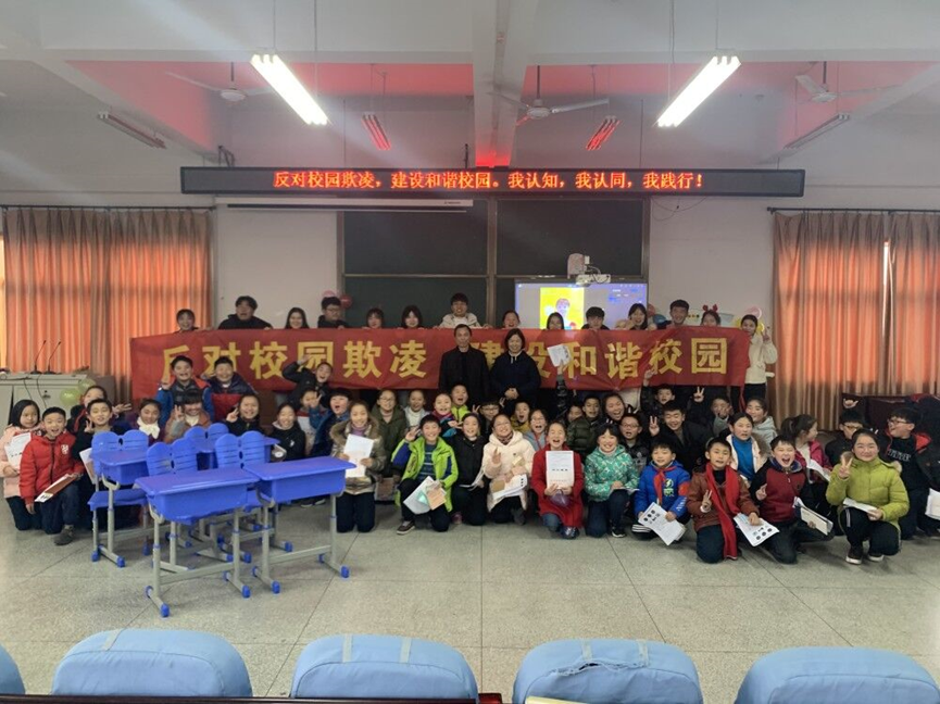 12月26日下午,在院團委的指導與支持下,院青年志愿者協會聯合衛崗小學少先隊,在衛崗小學北區舉辦“反對校園欺凌,建設和諧校園”的公益教育活動。此次活動由指導老師孫曉玲老師主持,合肥市衛崗小學副校長葛圣龍、衛崗小學北區少先隊輔導員張瑤以及學生和家長代表共100余人參加此次活動 。