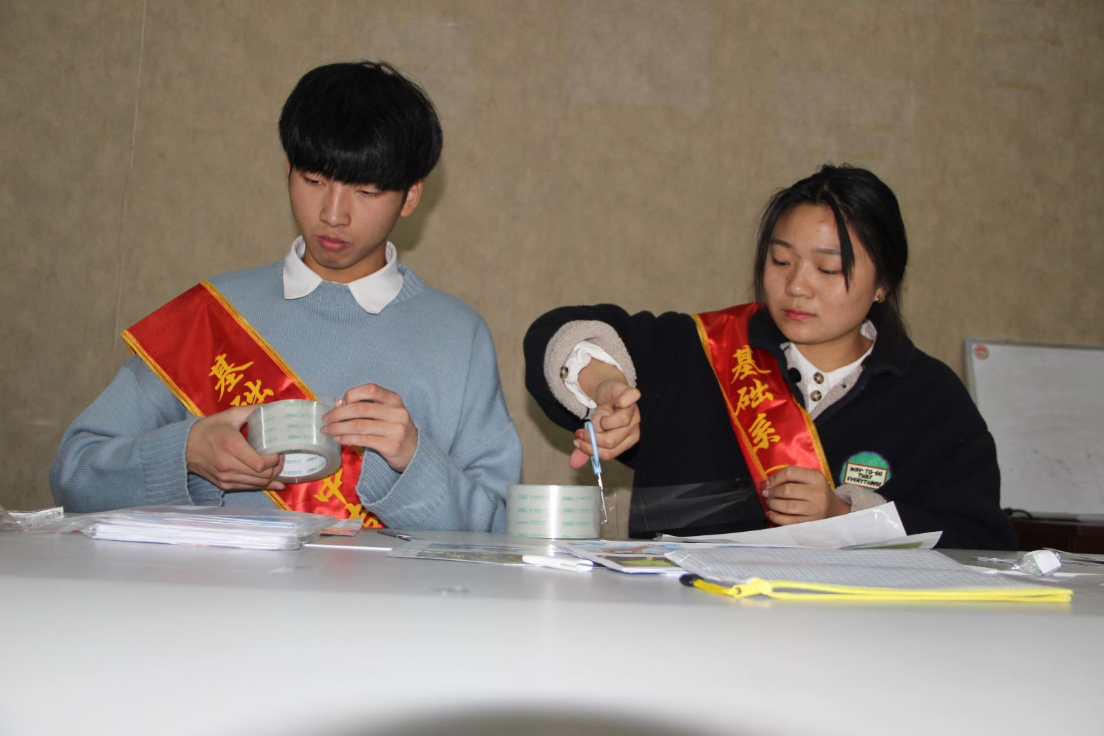 在簡單的培訓之后,八名志愿者幫助老師制作教輔用具。據(jù)王艷介紹,上課的教具很多都需要老師手工完成,給原本緊張的教師人手加重了負擔,志愿者們的到來大大緩解了人手不足的情況。
