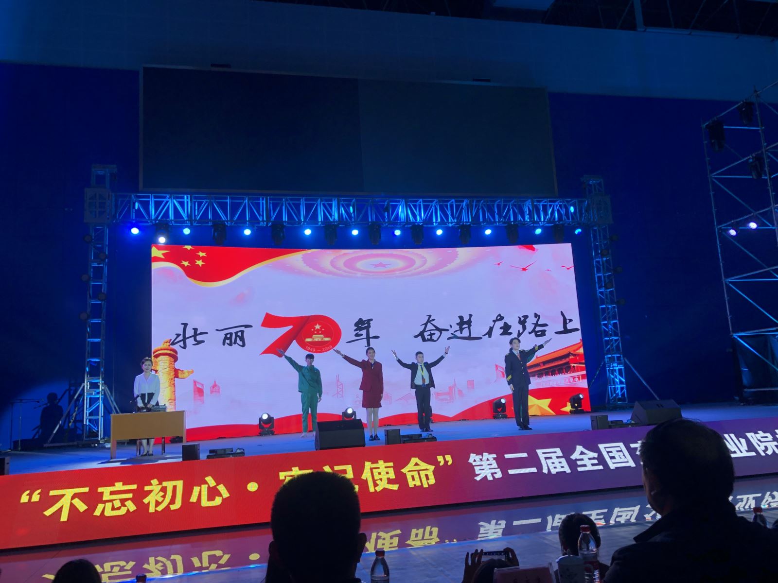 當晚的文藝展演,學院6名同學表演廣播劇《壯麗70年,奮進在路上》,情景再現了新中國成立70年來,安徽交通事業穩步發展,一躍成為中國交通史上一道靚麗的 風景線。也展現了我院學子在安徽交通發展歷程中,獻身一線的感人故事。獲得在場觀眾的一致好評。