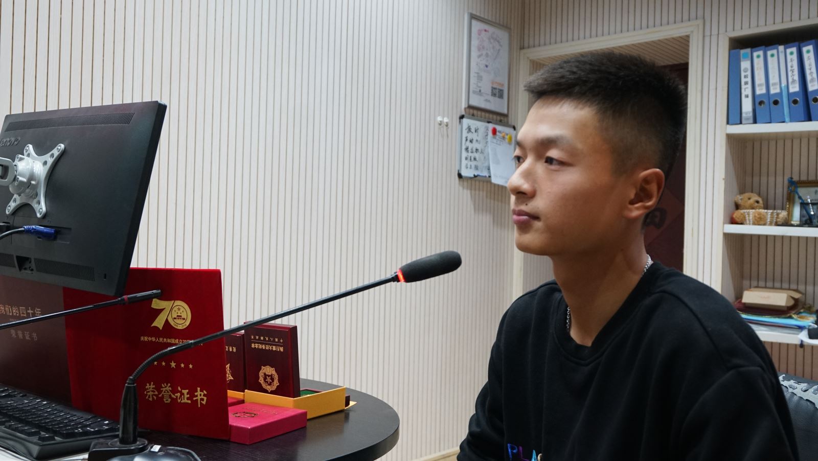 此次受閱機會來之不易。座談會上,兩位同學詳細介紹了長達八個月之久訓練過程的艱苦與磨礪。例如,需要通過直視太陽來鍛煉堅毅的眼神,通過一個小時起步的軍姿站立來訓練統(tǒng)一的步伐......,尤其是閱兵那天,當提到經(jīng)過天安門的一剎那,樊磊表示八個月的努力都值得了,向世界人民展現(xiàn)了中國風采。而由于禮炮手的特殊性,張凱奎需要單膝下跪執(zhí)行任務,他的膝蓋因為長期訓練已經(jīng)被磨平,但他卻說,我們這一跪跪的是先烈,跪的是為了新中國成立而犧牲的千千萬萬的先輩,我們此刻肩負的是我們的人民,是我們的祖國!