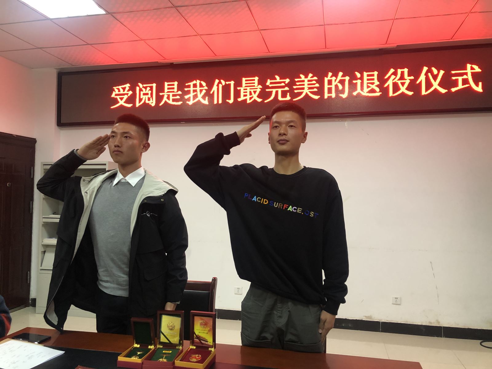 兩位同學也表示交院的生活與學習,為更好的融入軍隊奠定了良好的基礎。樊磊說,在學校里曾任學生干部,使他知道如何與上下級進行溝通協(xié)作。張凱奎也稱,在學校里提前適應了獨立生活,在隊伍中也可以很好照顧自己。當提到學生干部的職責與使命時,樊磊說,當咱們交院的學生干部,既是一份驕傲,也是一份挑戰(zhàn)。作為老師的好幫手要起帶頭作用,以身作則,帶領大家做事情,做好事情。即將回歸校園的張凱奎也正在積極調(diào)整心態(tài),實現(xiàn)從軍人到學生的過渡。現(xiàn)場的同學們也紛紛向兩位學長提問取經(jīng),兩位學長耐心解答,讓大家感受不一樣的閱兵幕后故事。當樊磊同學現(xiàn)場展示當兵及受閱期間所獲榮譽獎章時,同學們才明白這沉甸甸獎章背后的汗水和心酸!座談會結(jié)束之余,兩位同學向在座各位行了標準的軍禮并踢了正步。