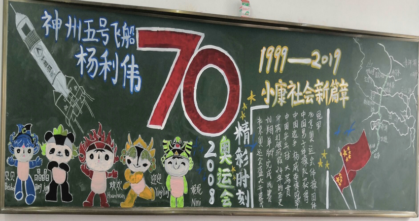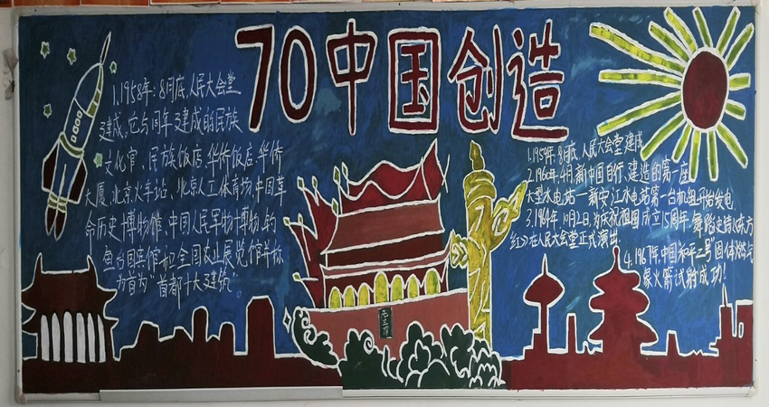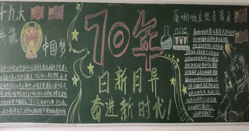 在基礎系團總支的統一安排下,七個班級分別以十年為一個節點,出版主題板報,形成系列板報,齊心協力書寫對祖國的熱愛。學生們在方寸之間,以凝練的語言和樸實的圖畫記錄新中國一路走來的風雨和成就。兩彈一星、改革開放、港澳回歸、“嫦娥”探月、“蛟龍”入海、“遼寧”入列……學生們在條件有限的情況下,一筆一畫地展示出了祖國取得的傲人成就,合成了一幅壯麗的新中國圖景。