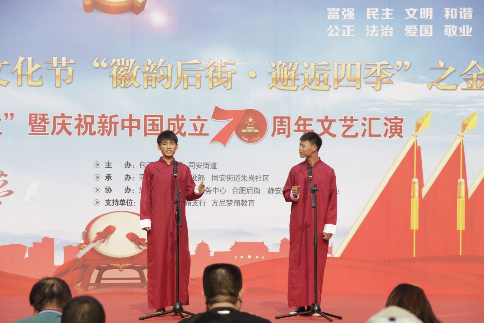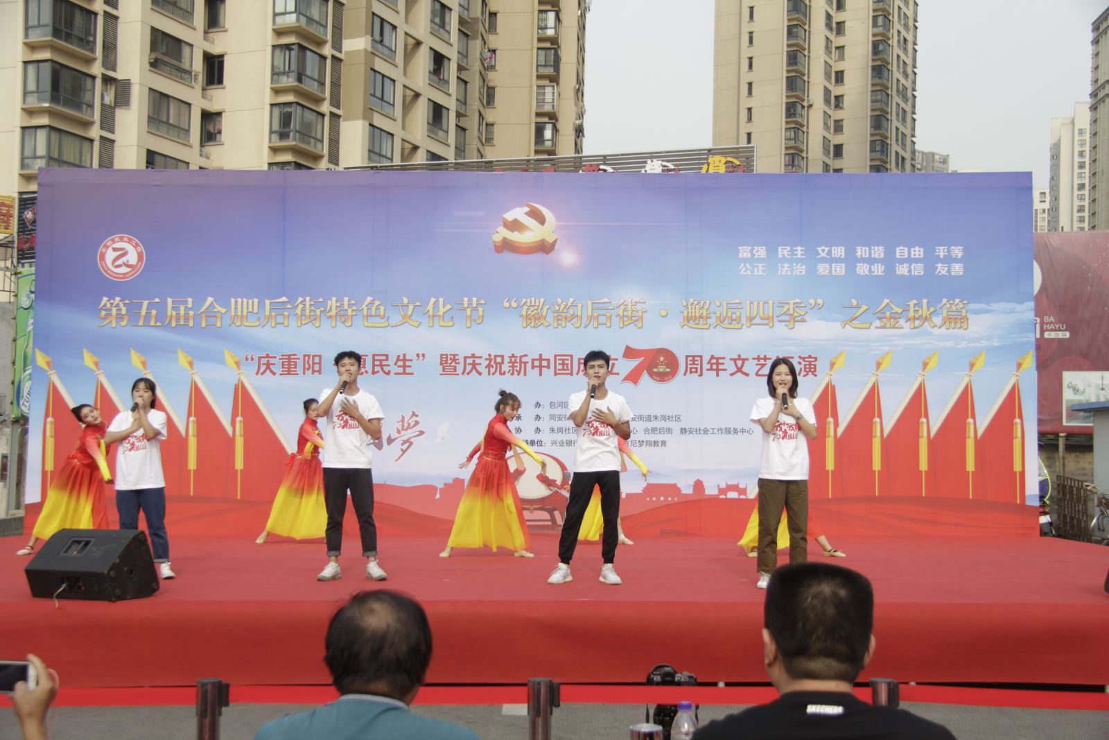 9月24日下午,學院大學生藝術團應邀參加由朱崗社區舉辦的“徽韻后街?邂逅四季”金秋篇“慶重陽?惠民生暨新中國成立70周年”特色文化節活動。活動由團委肖虹老師帶隊,10余名學生出演了其中的兩個節目,取得良好效果。