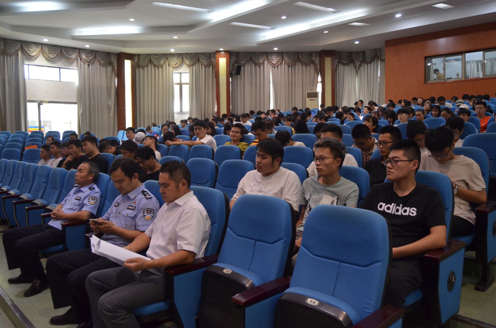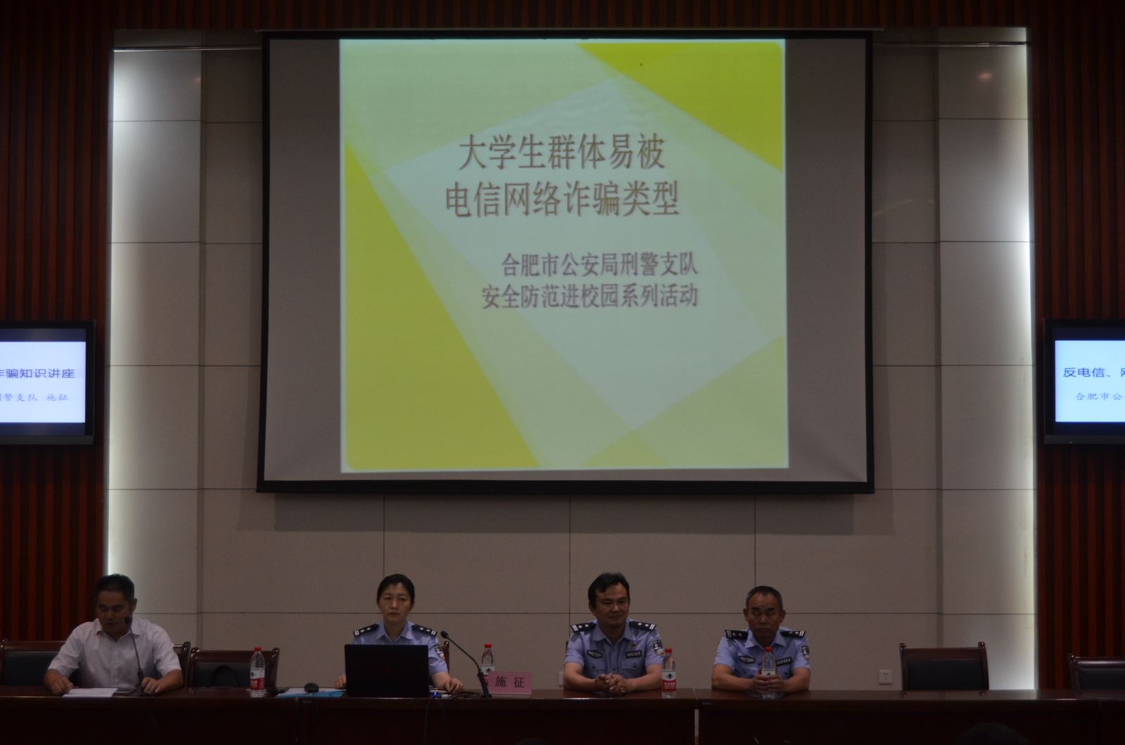 為加強校園安全管理,提高學生安全意識,9月25日下午,由保衛處和學生處主辦,以 “反電信、網絡詐騙”為主題的知識講座在八角樓學術報告廳舉行。特邀合肥市公安局刑警支隊反電信詐騙中心施征警官主講。講座由保衛處處長袁大方主持,現場數百名同學聆聽。