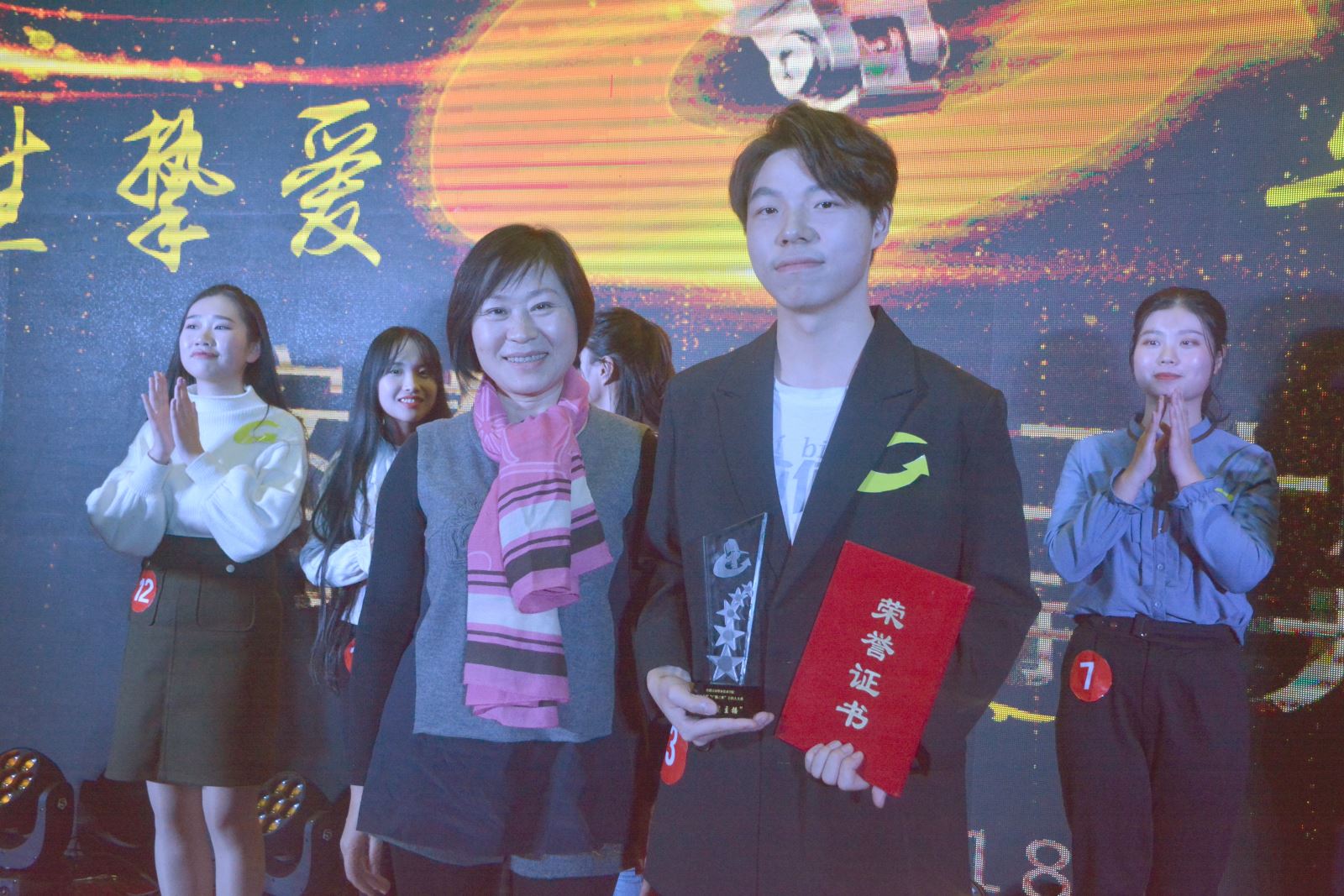 兩輪比賽結束后,四位歷屆大賽冠軍深情演繹了主題朗誦《此生摯愛 與聲聚來》,帶大家回顧了“廣播之夜”主持人大賽的風雨二十年。之后,由程祺主唱的樂隊為我們帶來了歌曲《活著》,寓意交院學子未來可期。比賽現場范仲濤認真做了點評,肯定了交院廣播取得的成績,以及選手們的精彩表現,并宣布比賽結果。管理系獲得本屆閃亮星主播馮暕,汽機系朱昊哲獲得“最佳人氣獎”,安徽音樂廣播總監安妮和學生處處長喻謹分別為獲獎者頒獎。