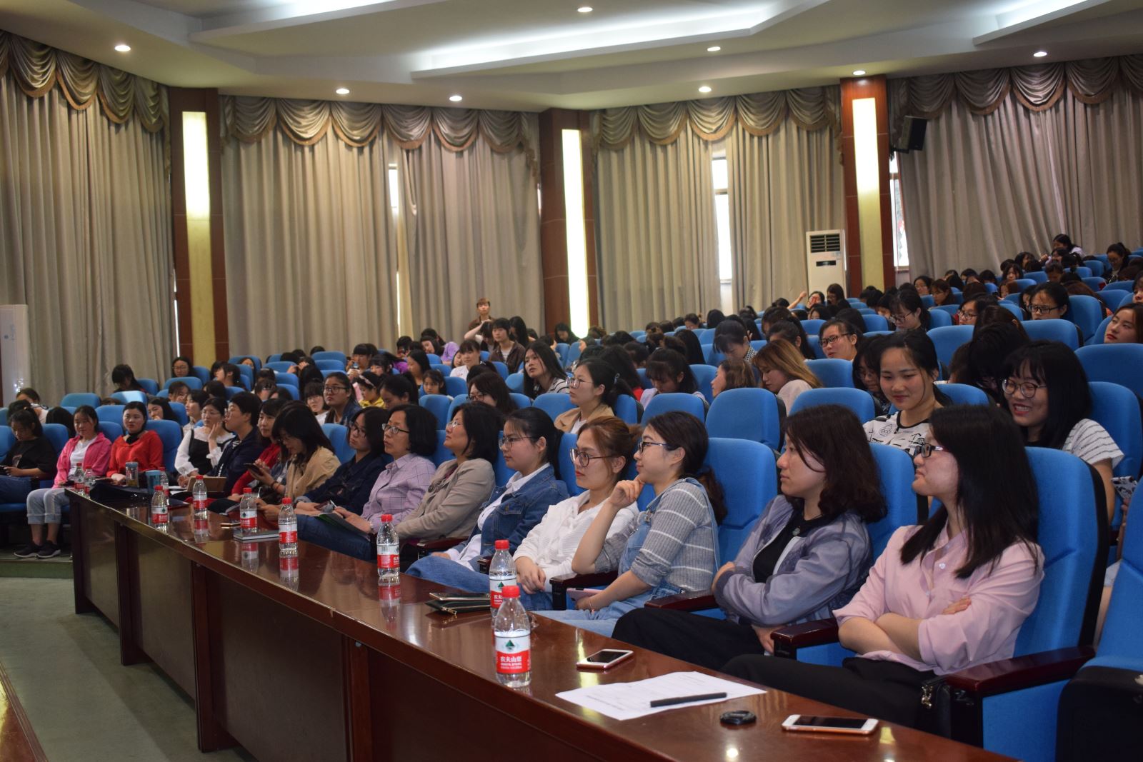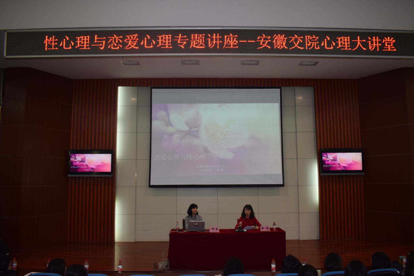 4月27日下午,心理大講堂之戀愛心理與性心理專題講座在北區八角樓開講。學生處喻謹處長主持,院系專兼職心理老師以及各系部約30位女老師、350名學生聆聽了講座。